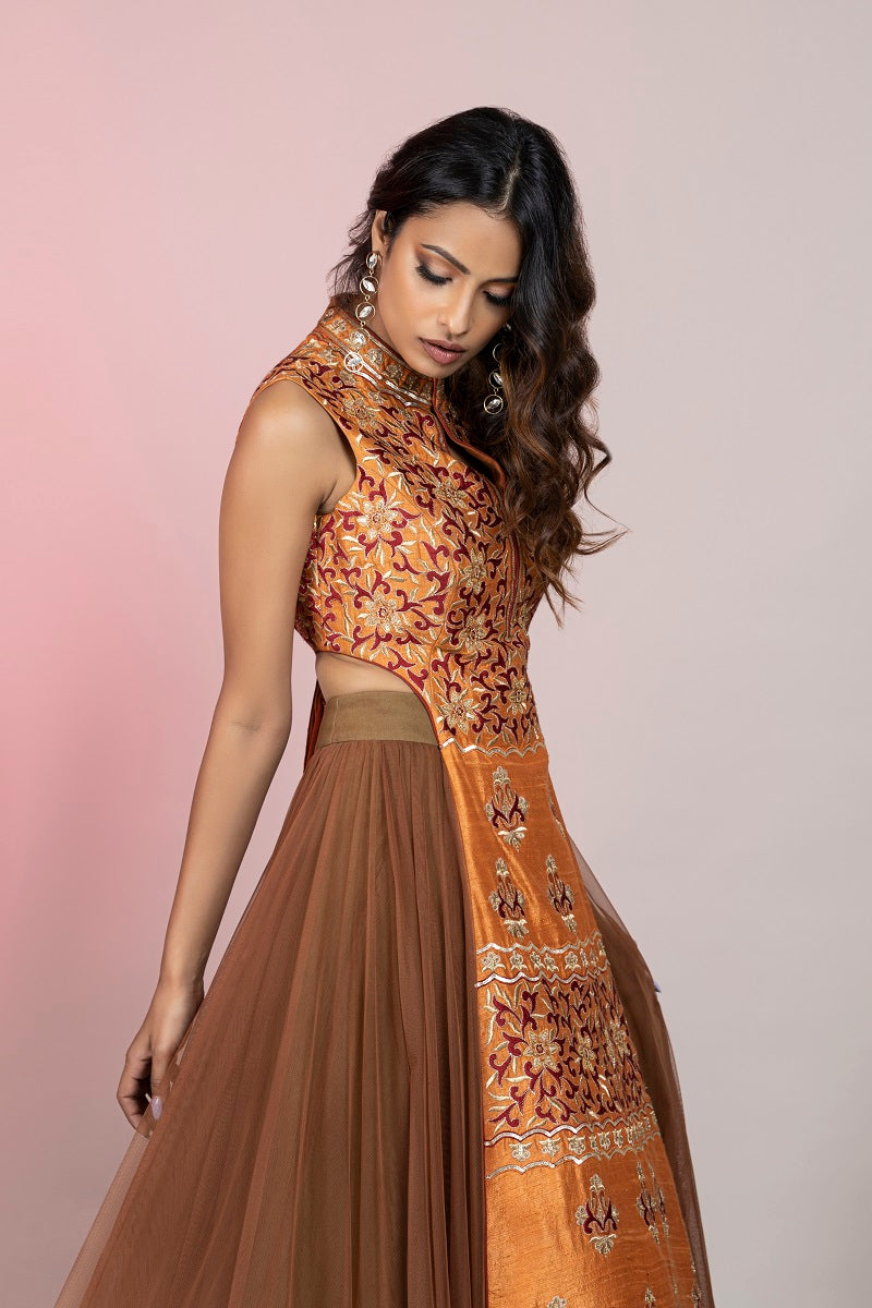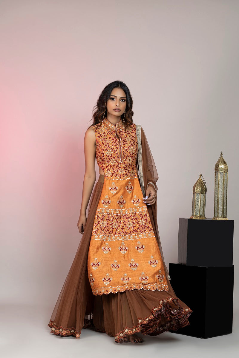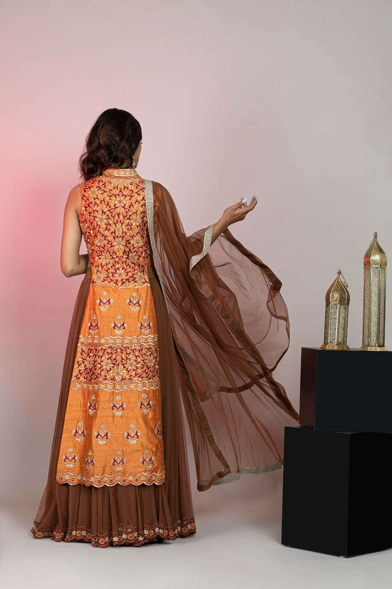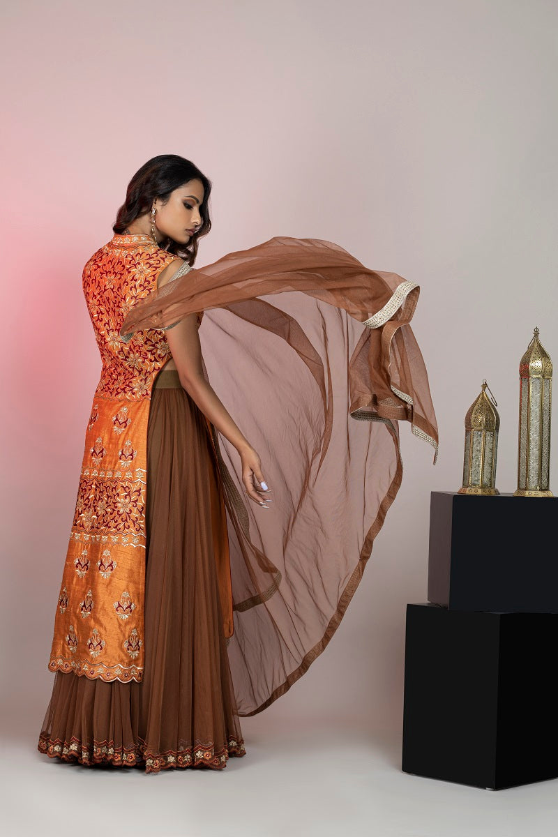 Andria floral orange pure raw silk love handle jacket paired with gathered net flared bordered skirt styled with sequin border chunni.