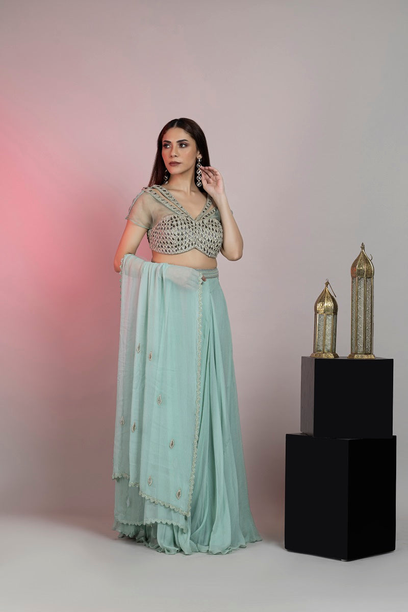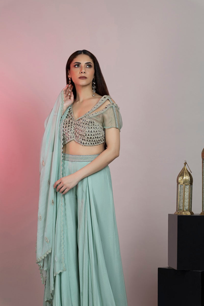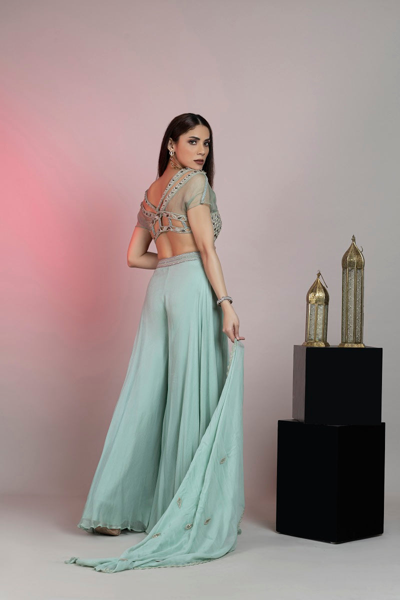 Anne turquoise pure crinkled chiffon and organza style lined diamond-shaped beaded patchwork paired with princess inverted box pleat palazzo pant styled with scalped fine beaded border stole.