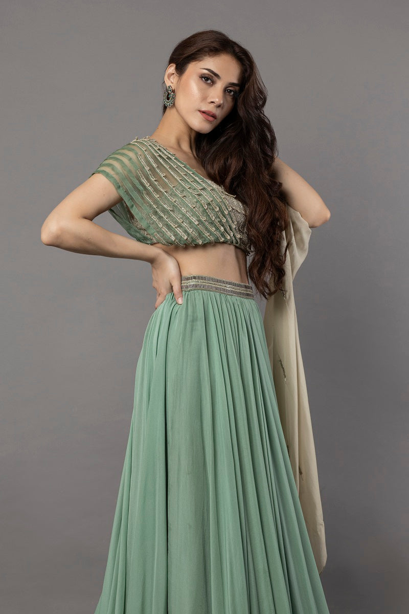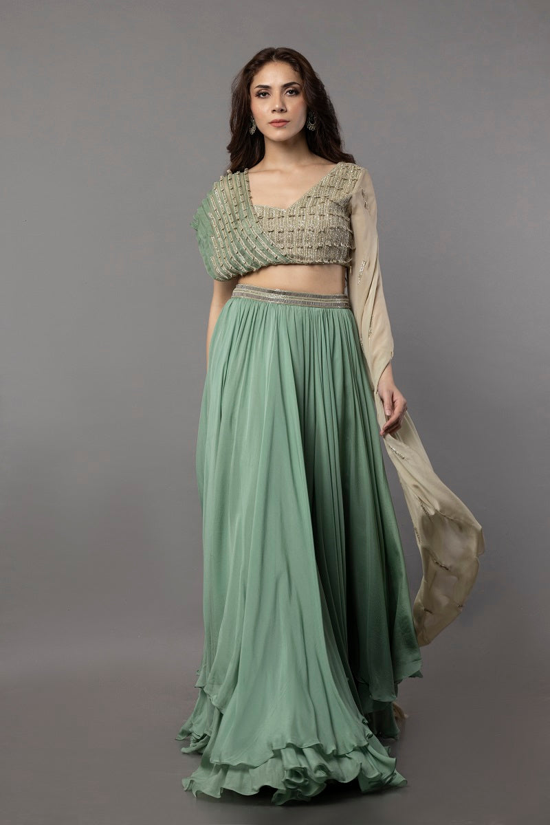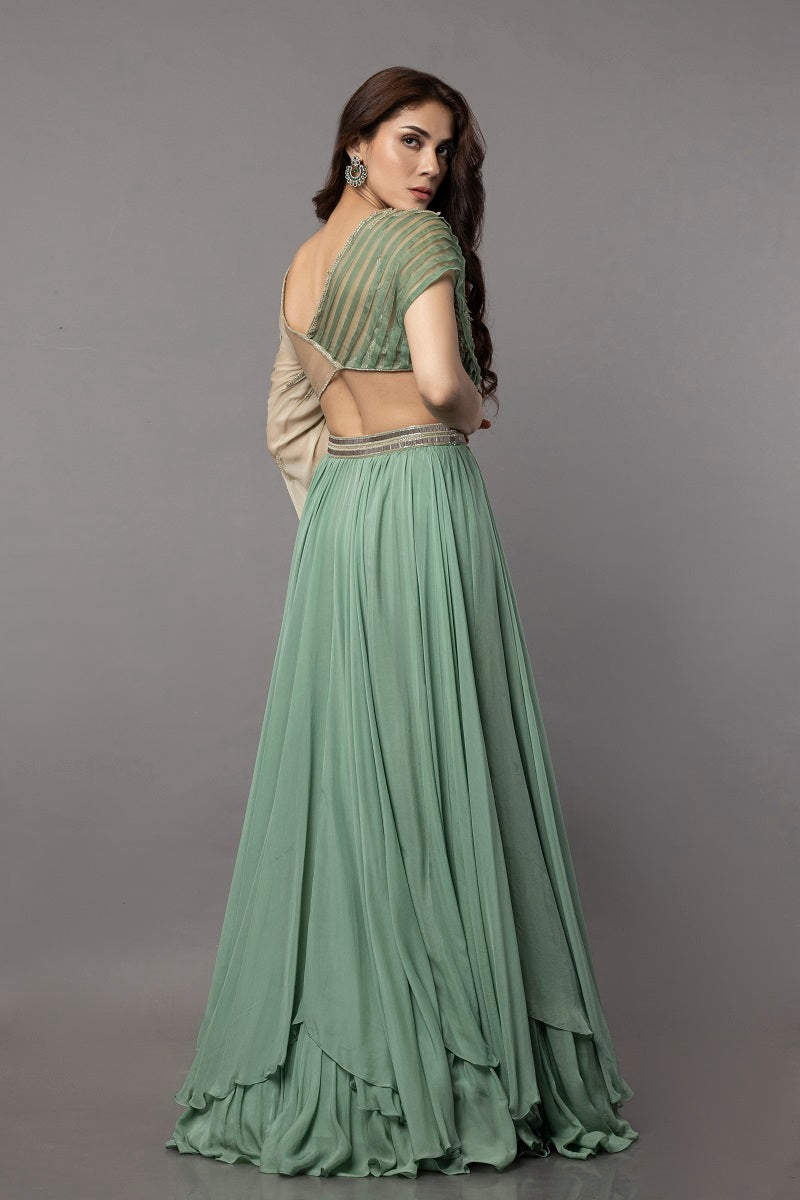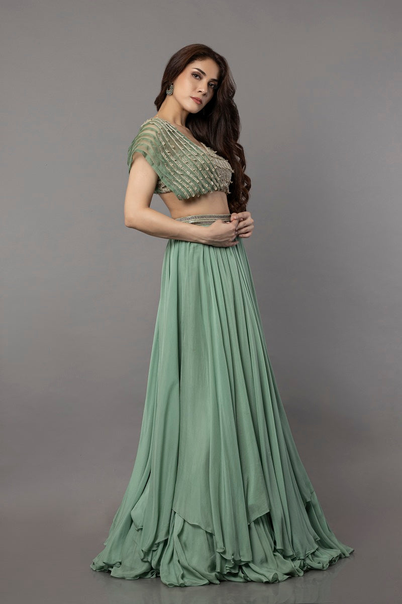 Aria aqua marine pistachio organza pleated cape style bodice embellished with fine hand embroidered patch with one side flat chiffon long slit embroidered sleeve, paired with flat chiffon fine gathered unevenly layered skirt embellished with a beaded belt.