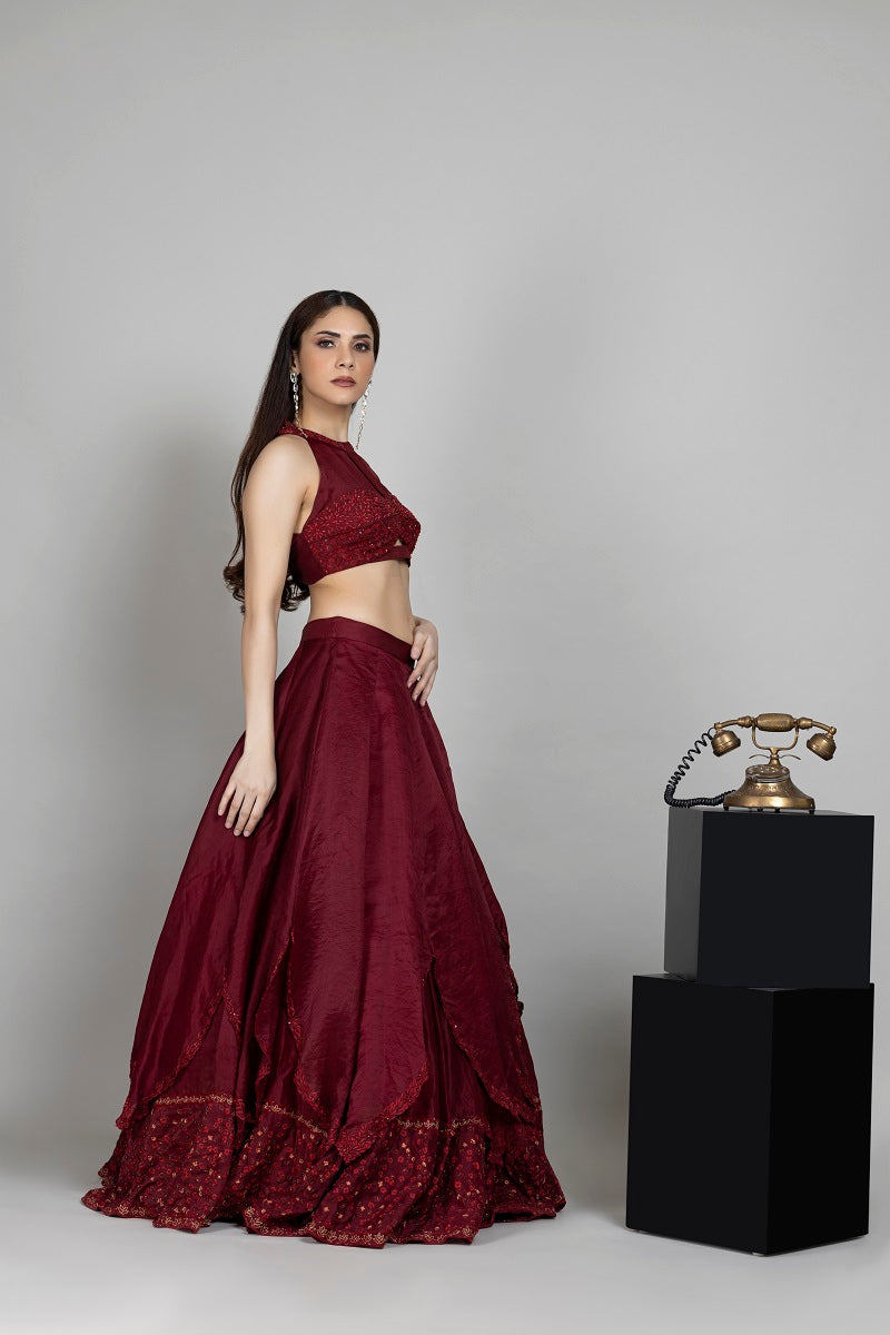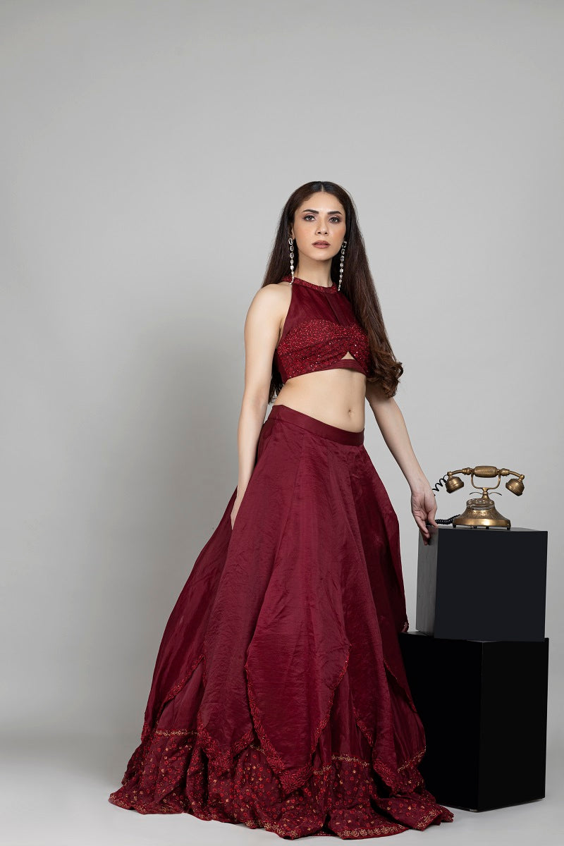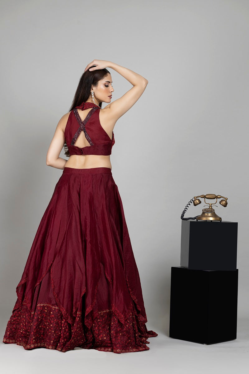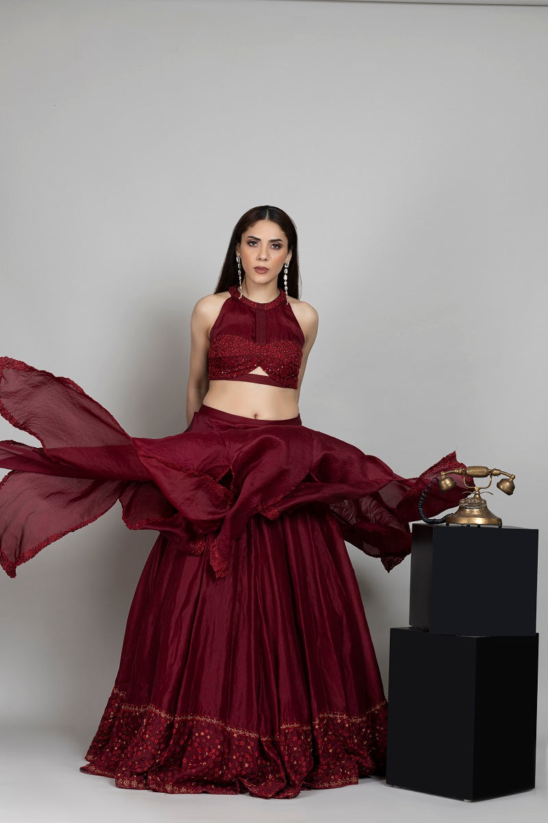 Aubrette blood marry pure silk dabka bead work paneled bodice with back studded with original Swarovski paired with tulip cut layered skirt styled with drape chunni.