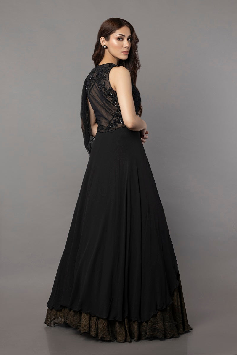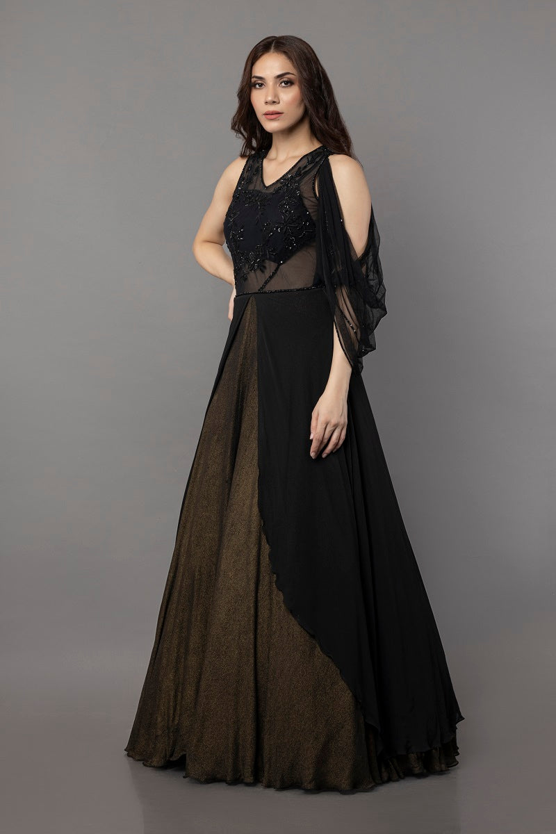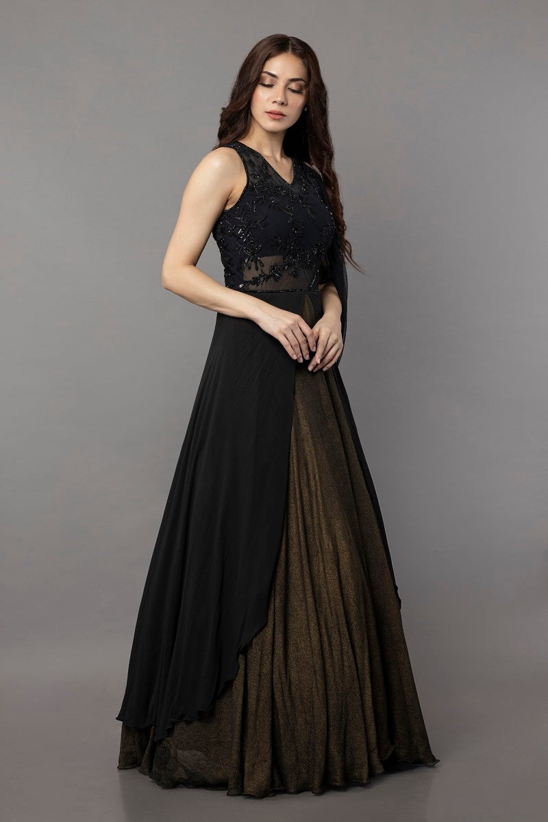 Aubri black and gold pure shimmer georgette layered gown embellished with fine beads detailed with a cowl at the shoulder.