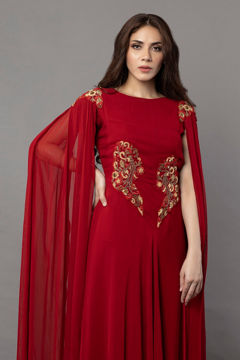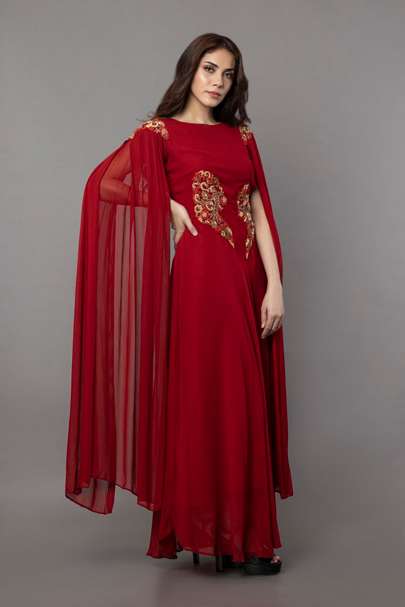Cerina claret red kaftan georgette dress embellished with beads and thread floral motif.