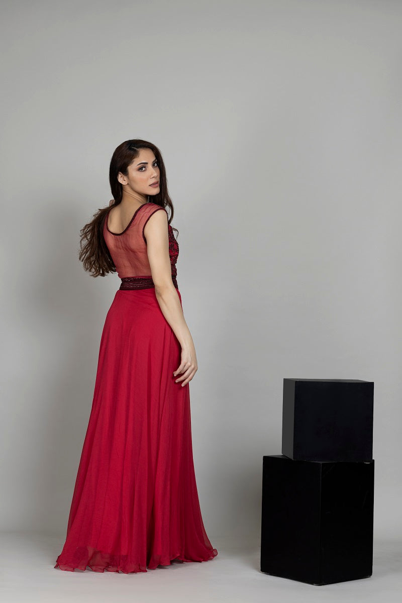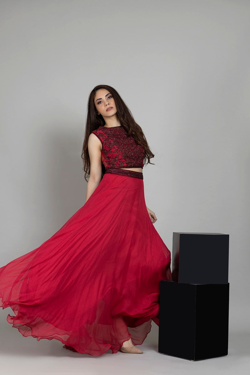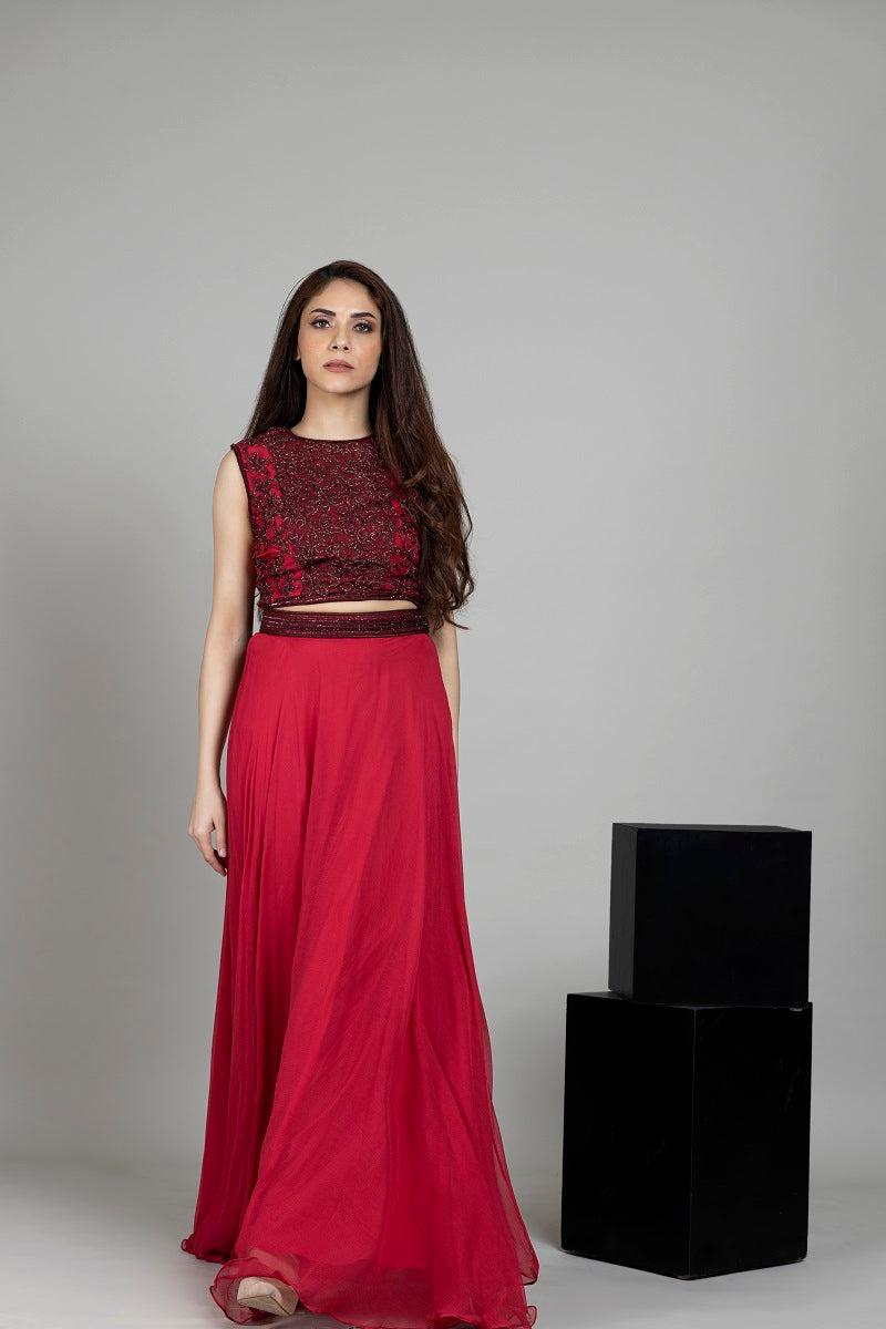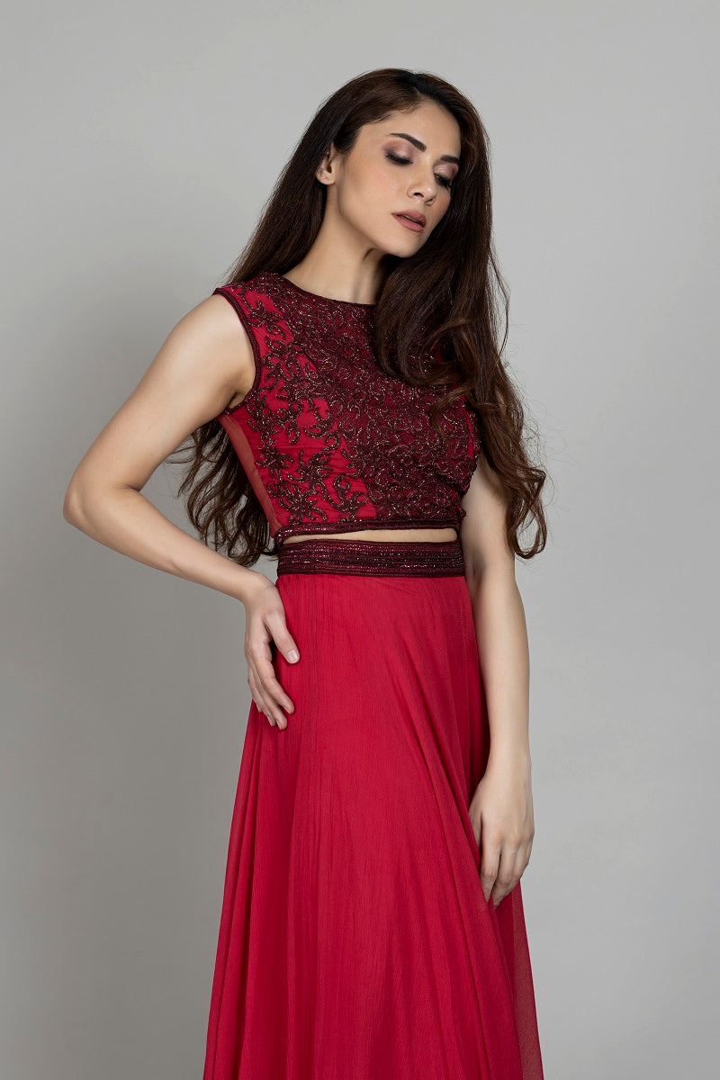 Cherry pop red pure silk organza french knot embroidered crop top paired with embellished pure chiffon skirt.
