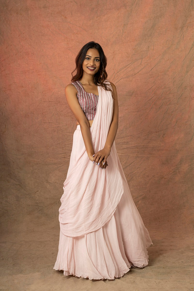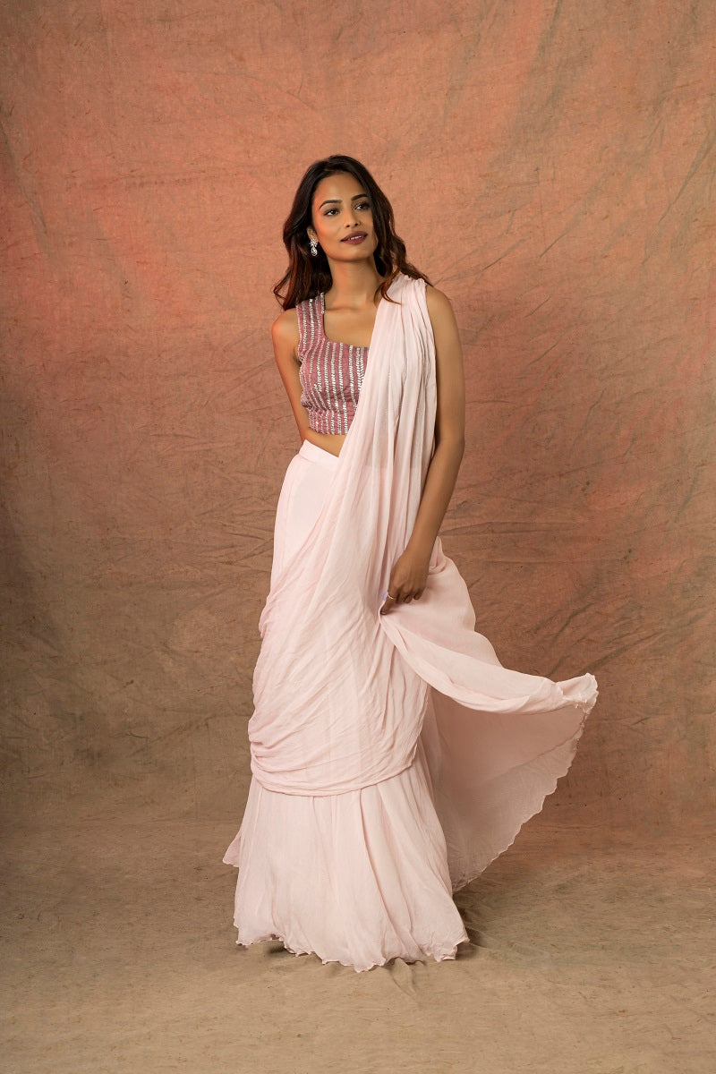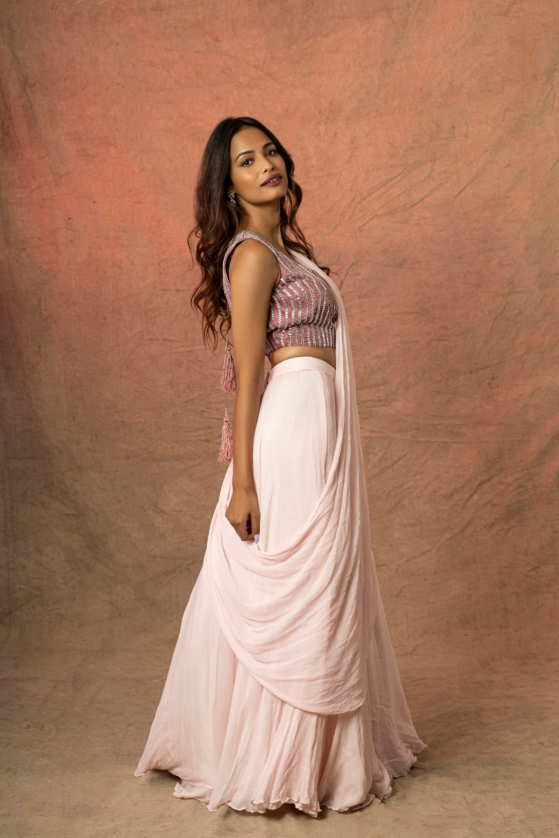 Mirror tugged with zari in linear pattern embroidered bodice.