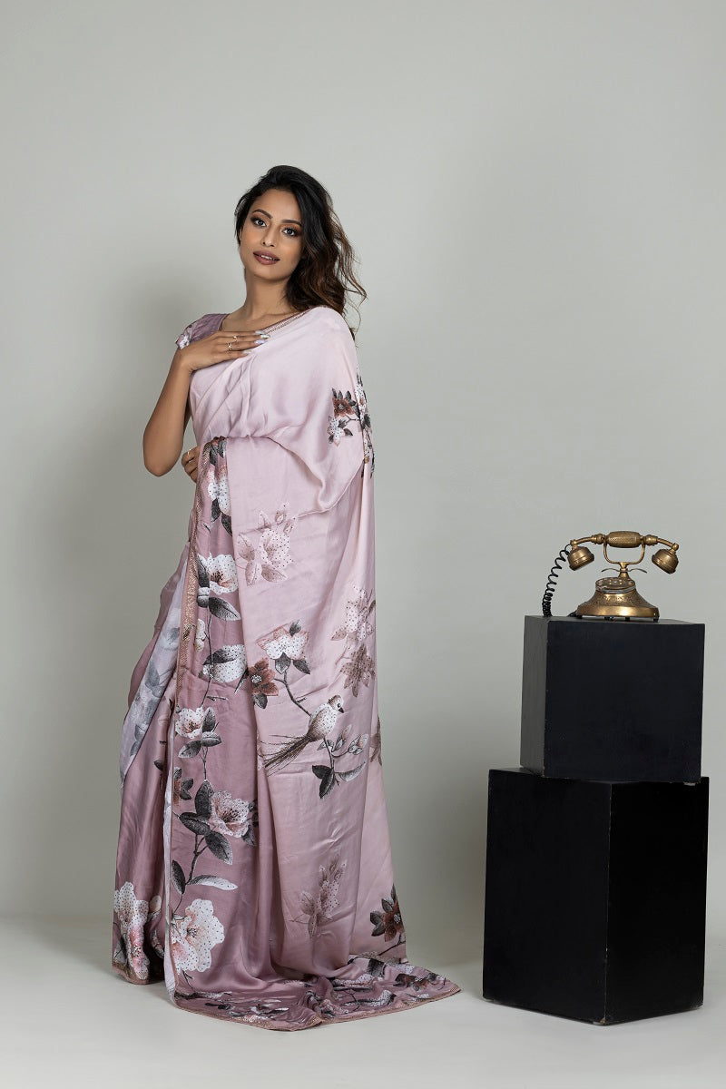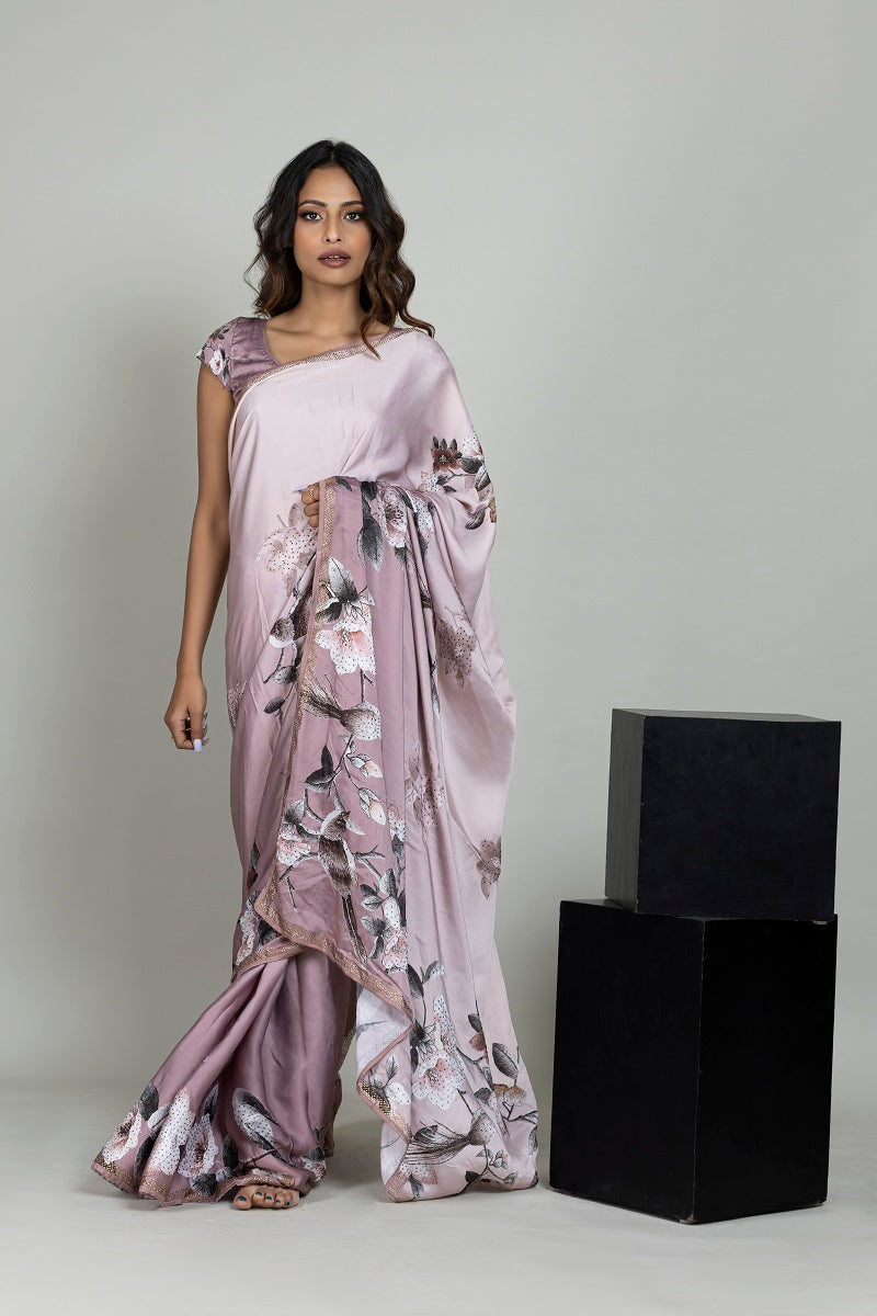 Ella silk satin dusty pink floral print ombre open saree with V-neckline bodice.