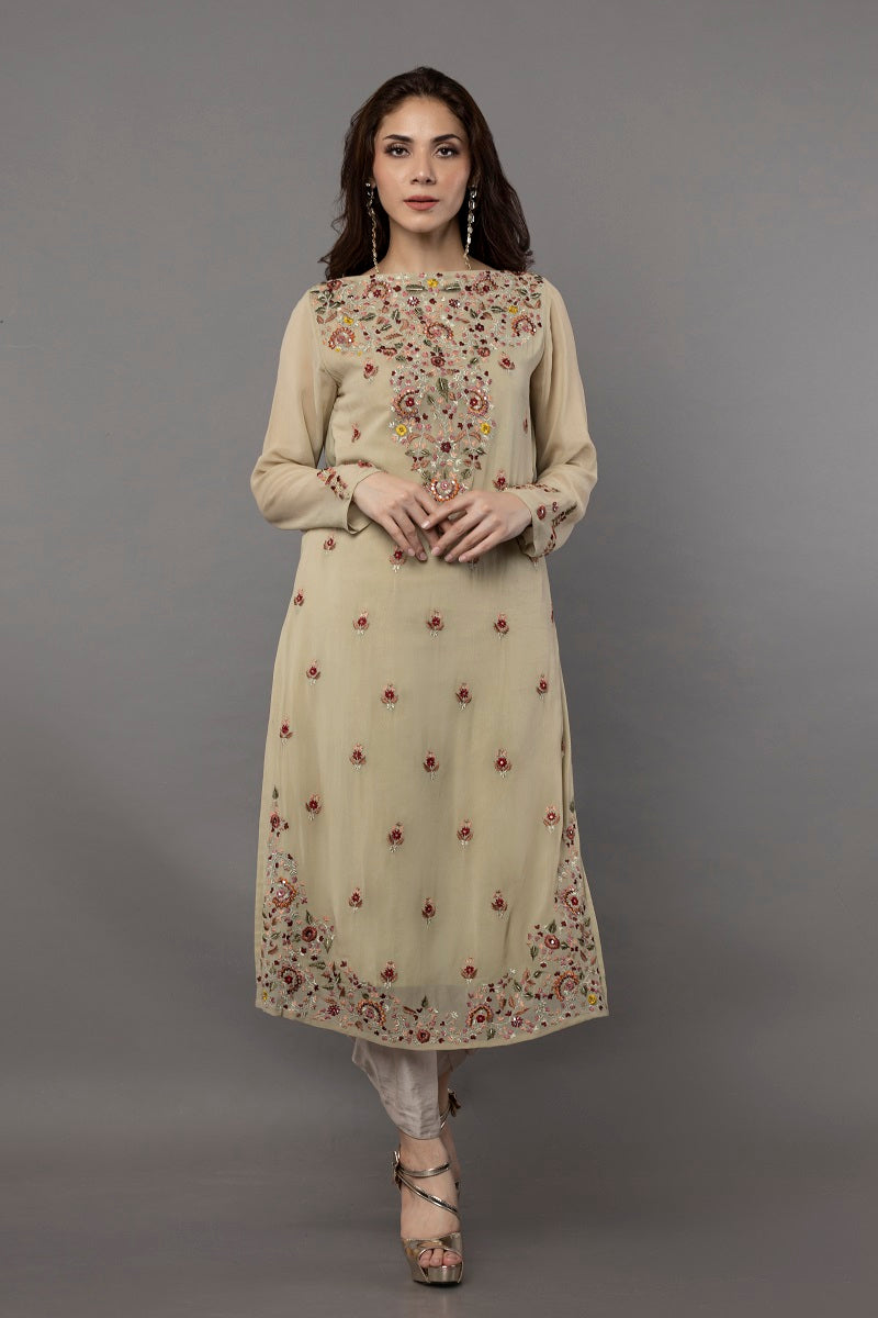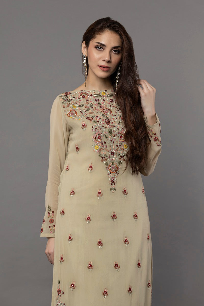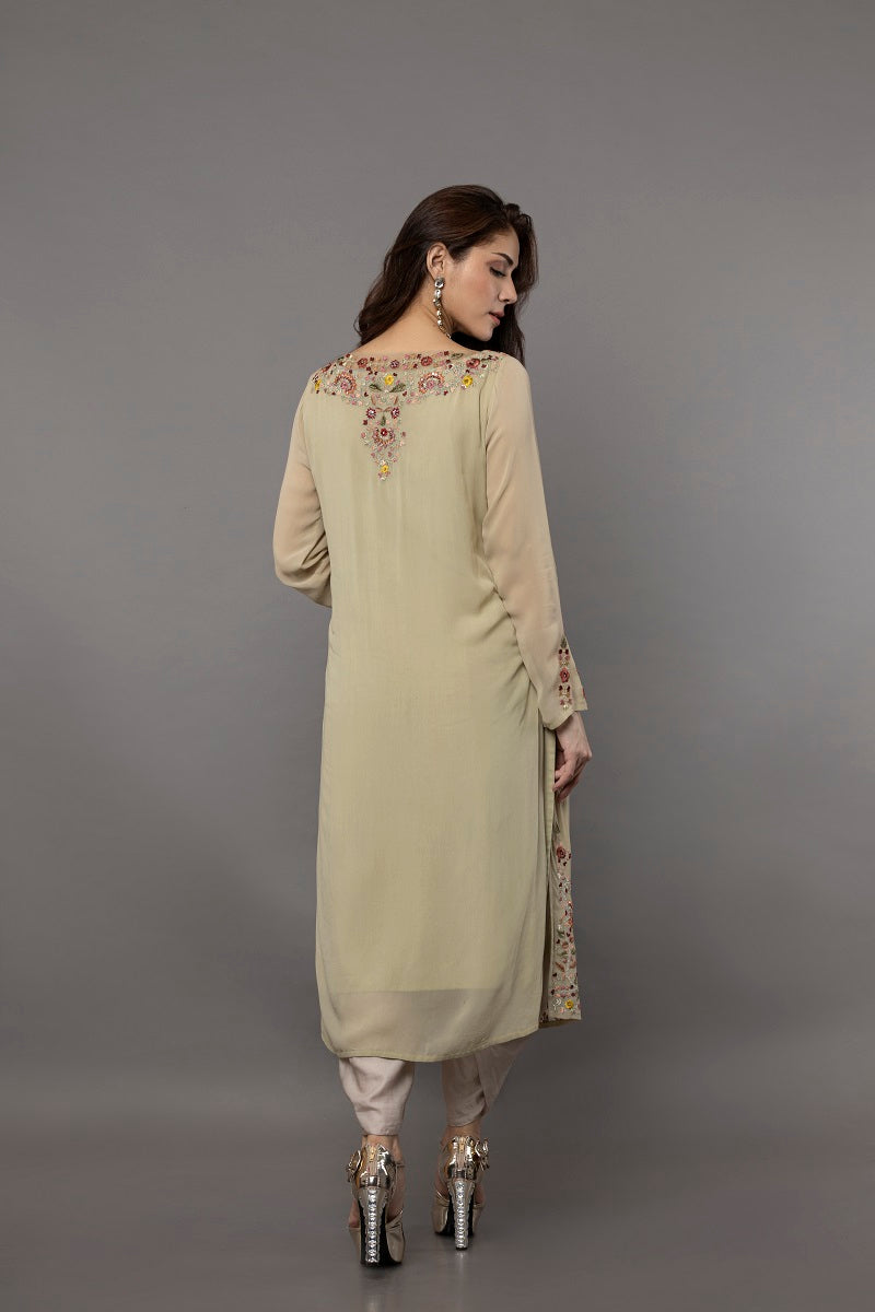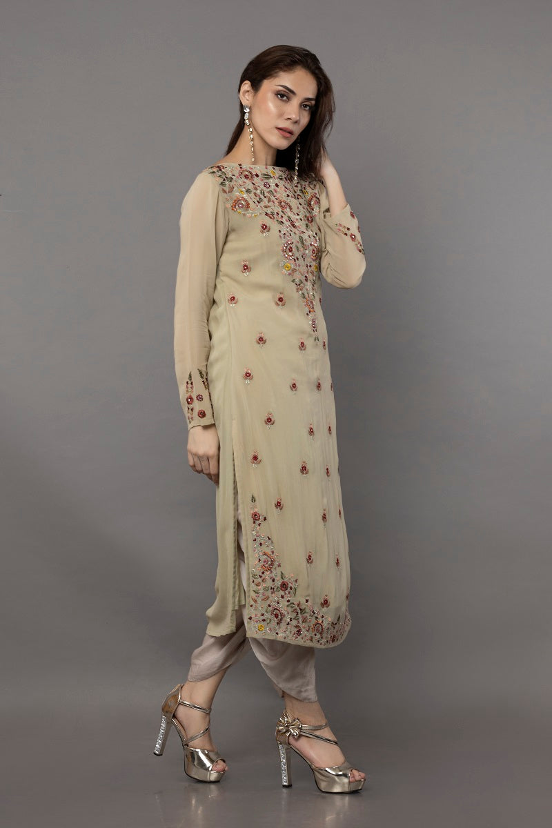 Ellie pistachio georgette Kurti with boat neckline embellished with multicolored floral embroidery paired with cotton silk pattern silver dhoti pants.