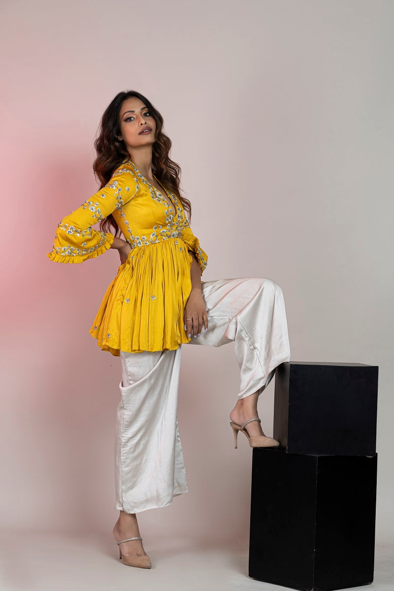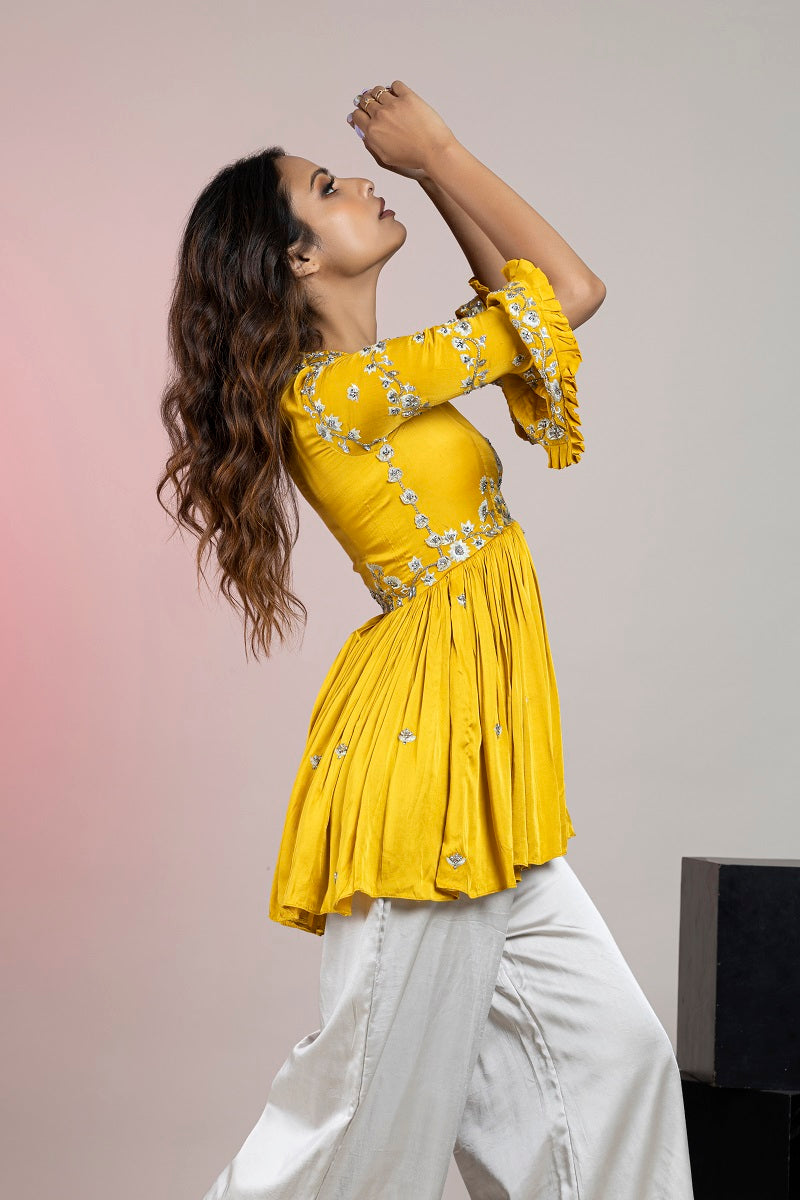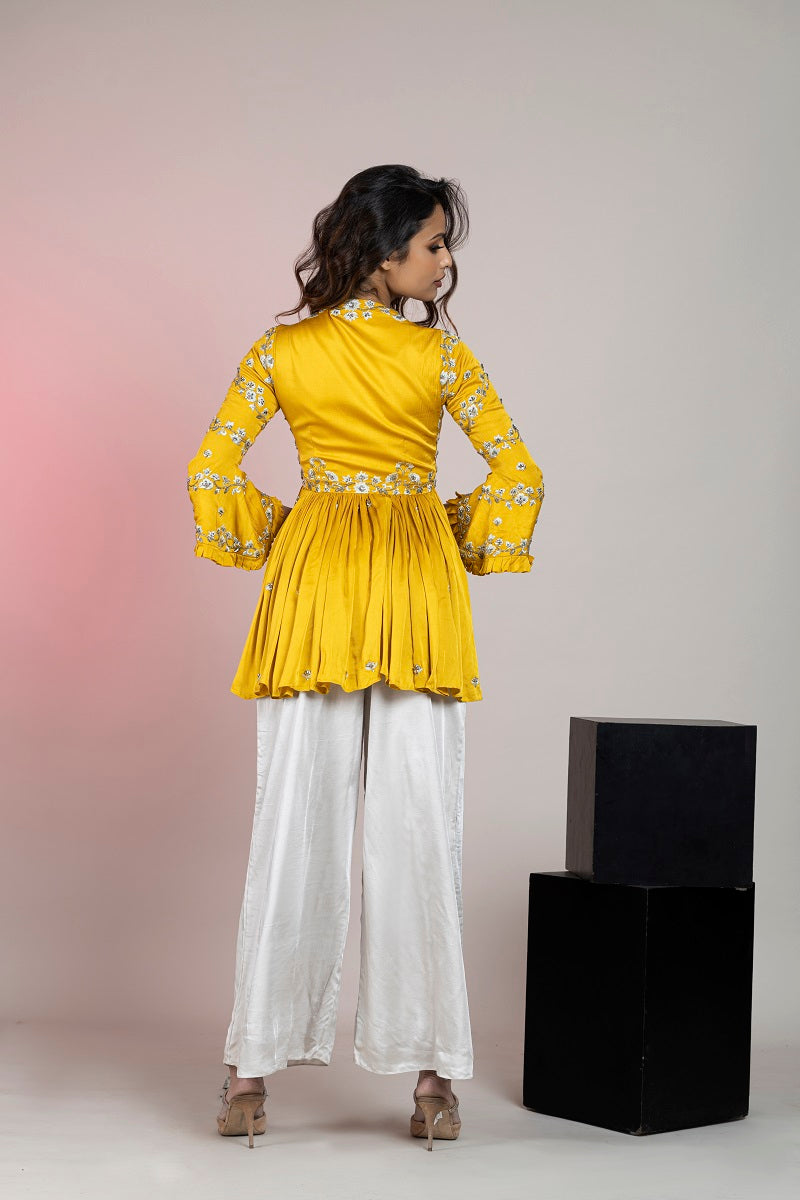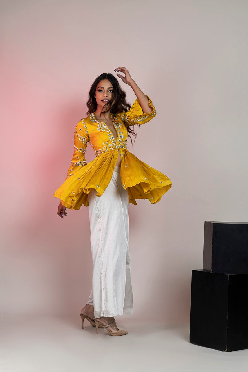Flora mustard modal silk satin peplum front open V-neckline tunic with bell sleeves detailed with fine pleat & gather at the waistline paired with cotton silk satin silver straight pants.