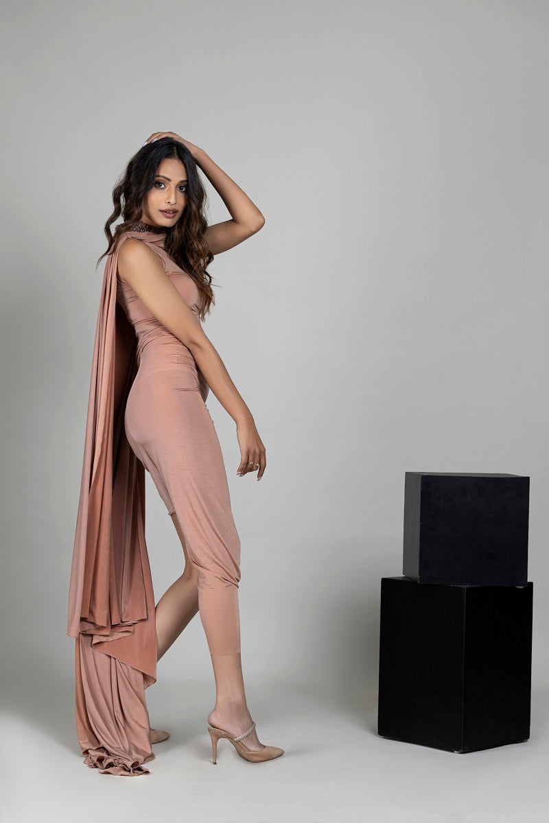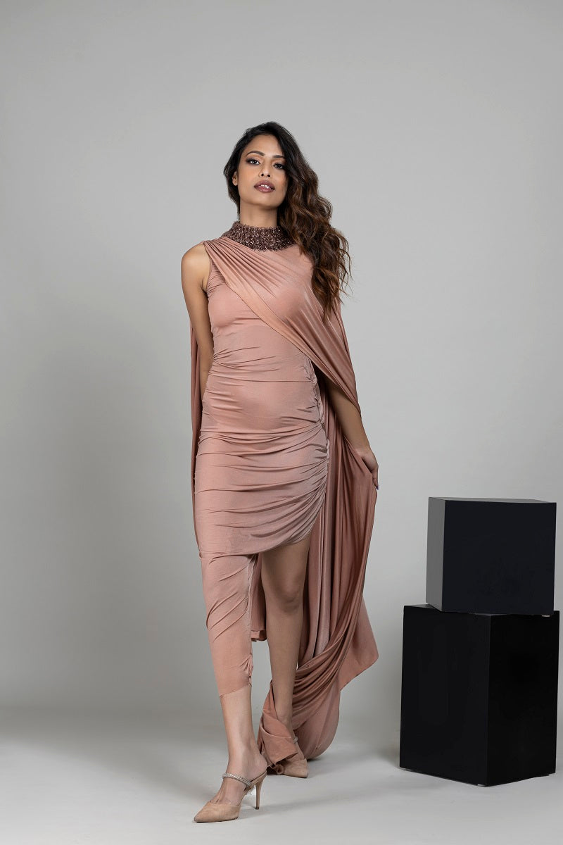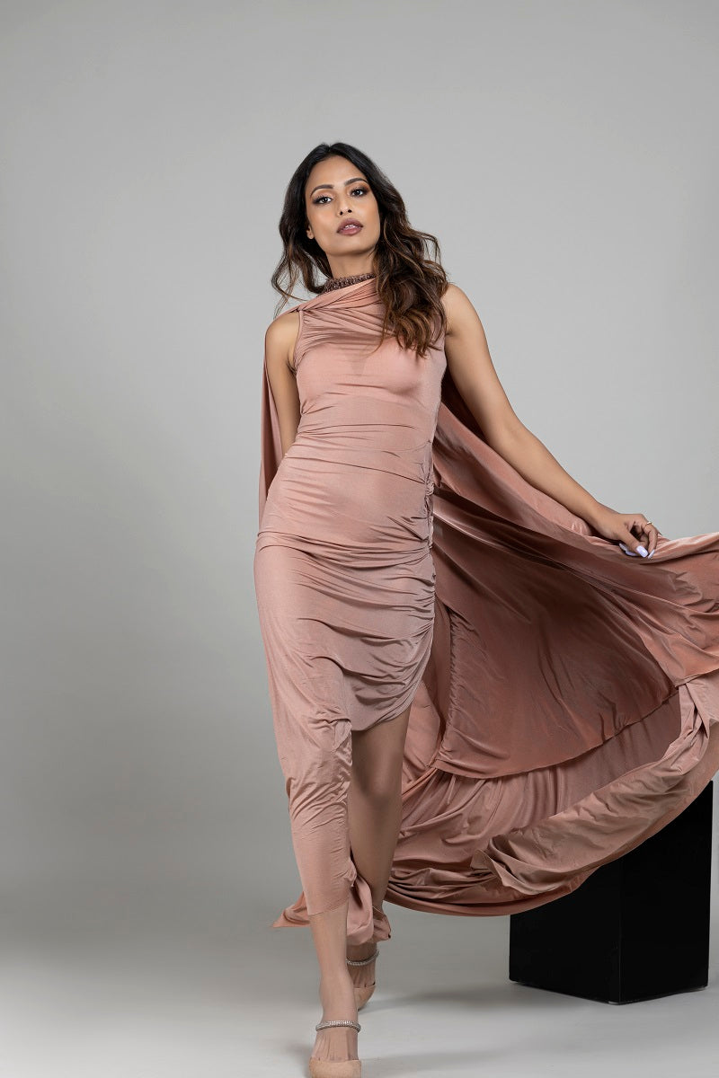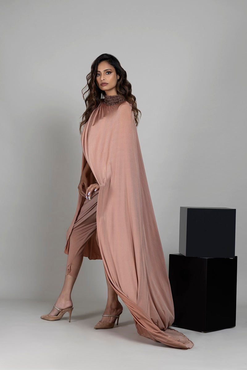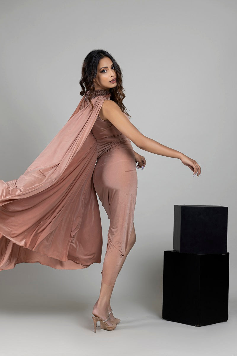 Glare champagne rose cape-style body con drape dress with fine hand embroidered motif patchwork at the collar.