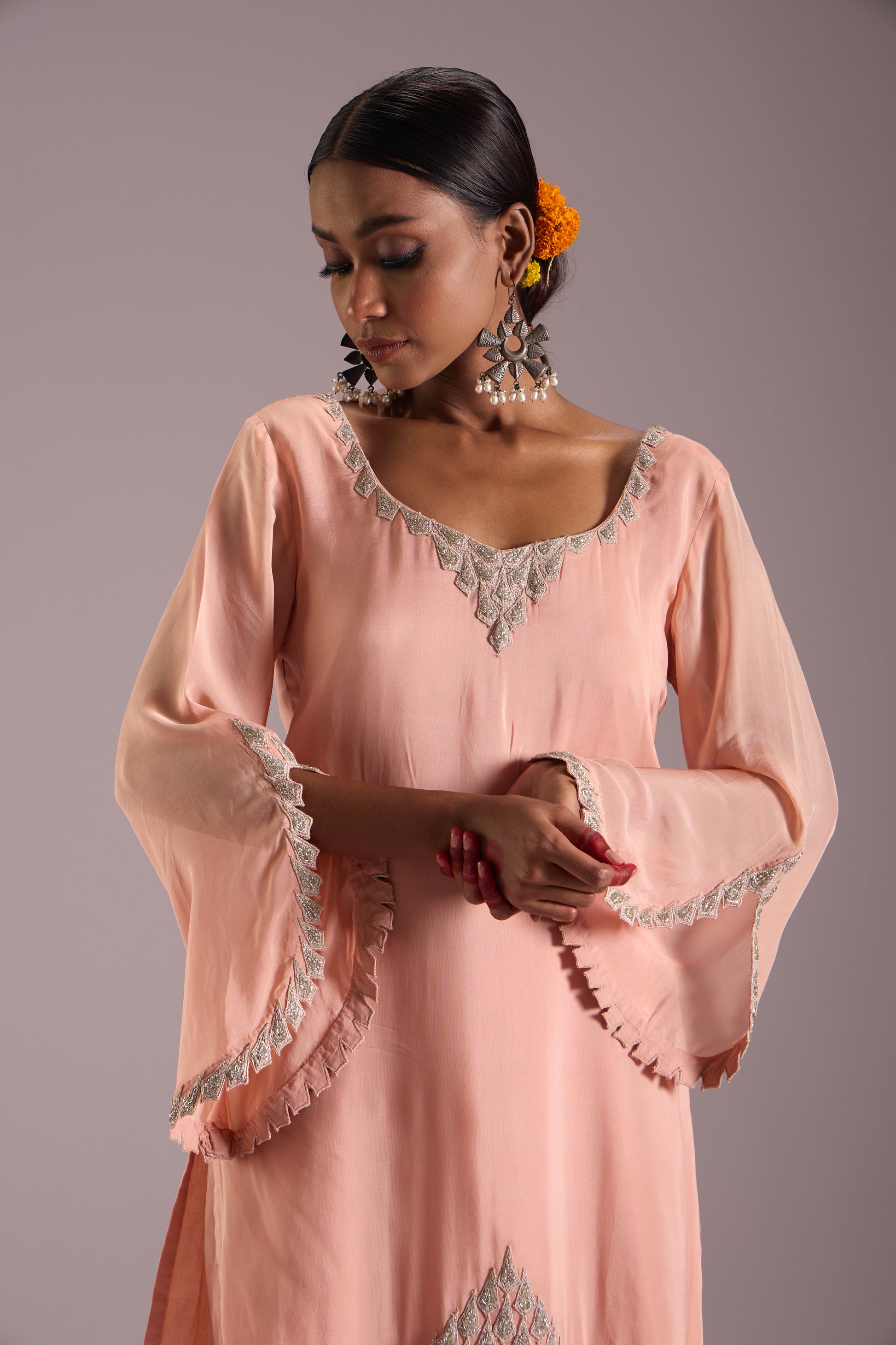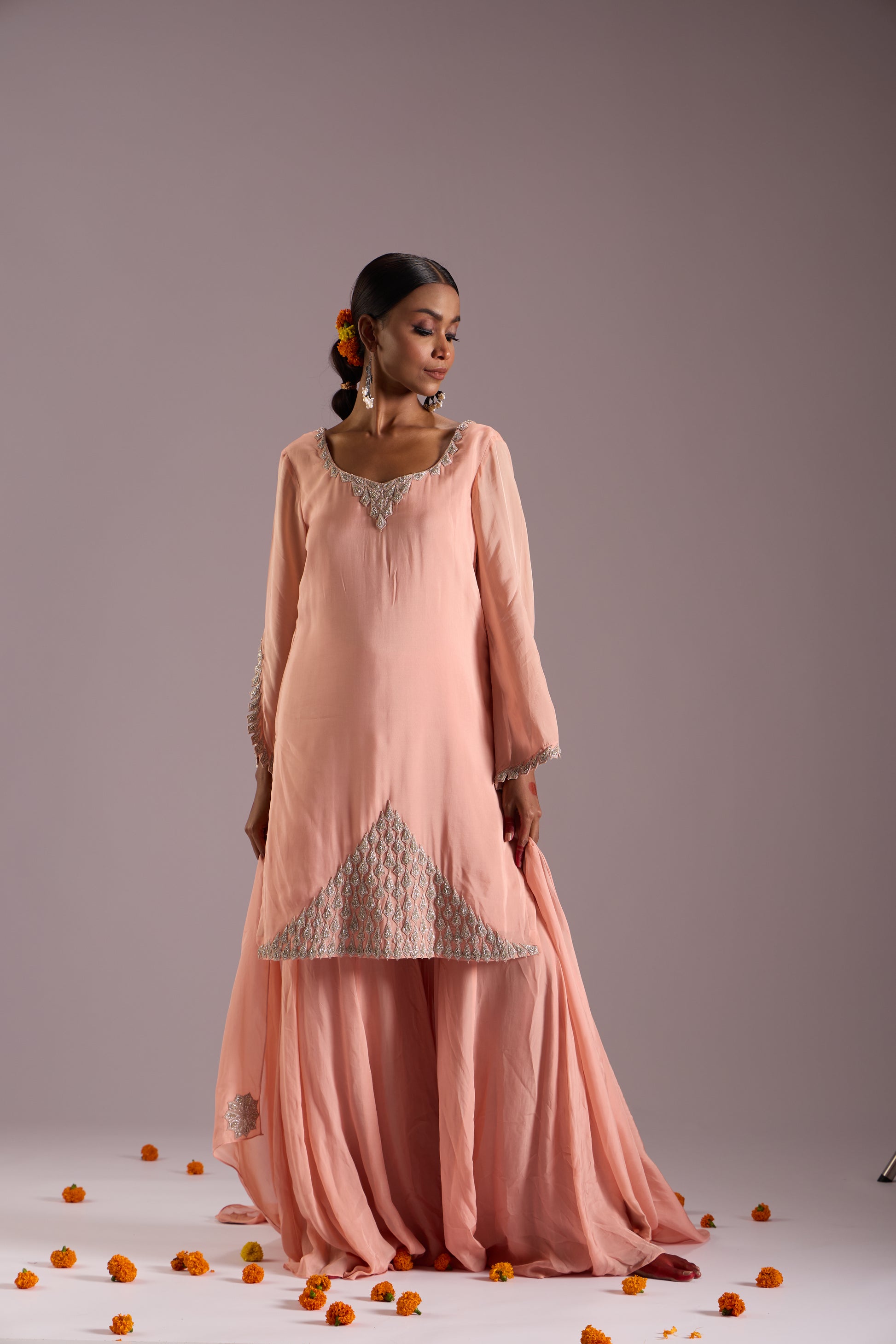 motif appliqué hand embroidered ,cutwork suit paired with half circle plaazo styled with tassel dupatta.