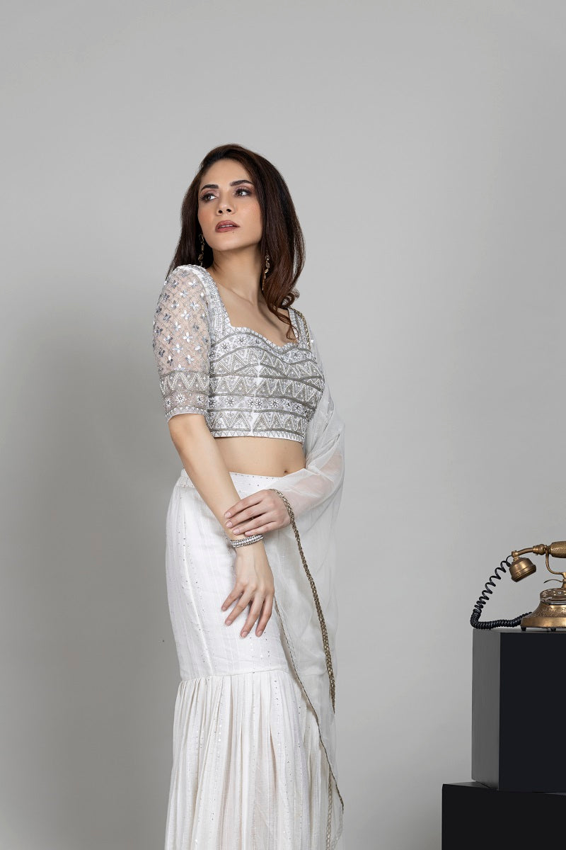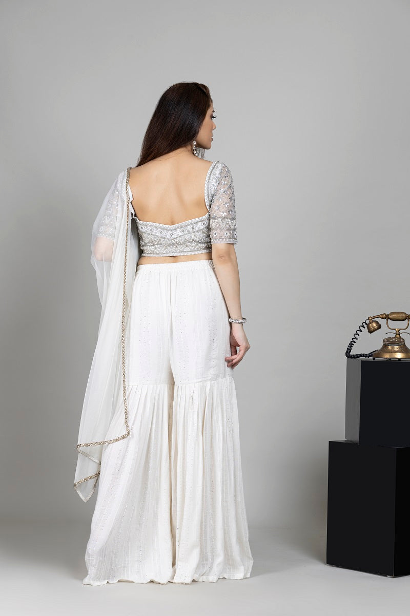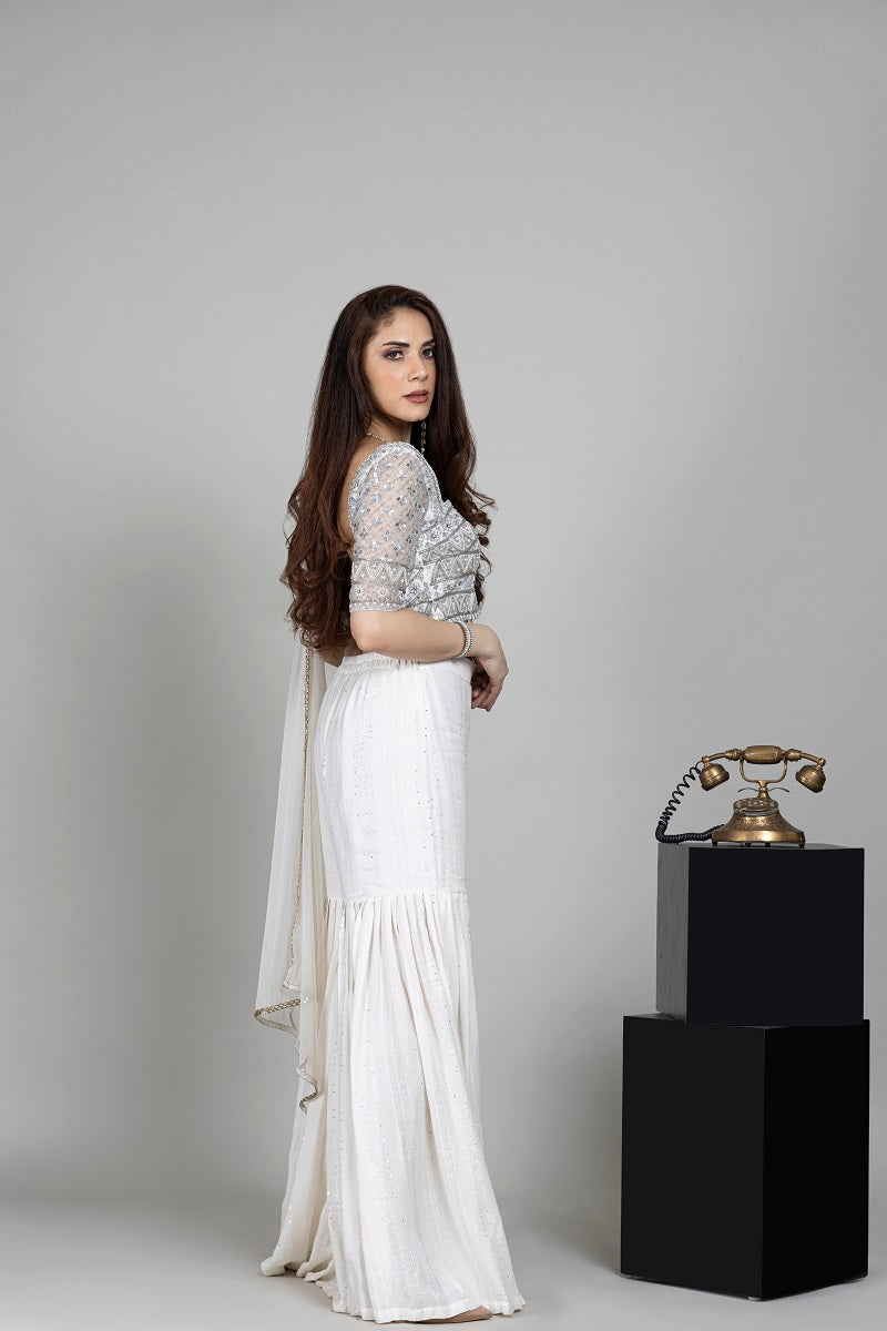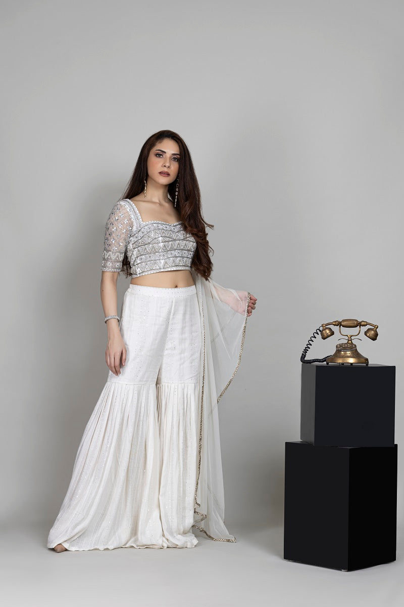 Iris silver- Ivory heavy bead embroidered scalped squareneck blouse paired with ivory sequin gharara pants styled with chunni.