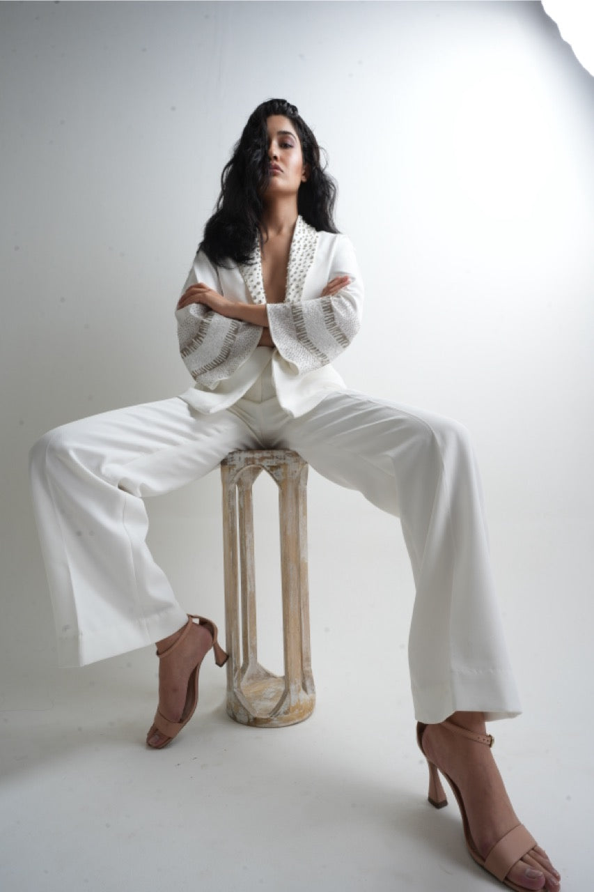 A refined cord set crafted for understated luxury. this hand embroidered coat and pant ensemble balances modern tailoring with intricate craftsmanship, making it ideal for elevated evenings , celebrations and statement occasions.