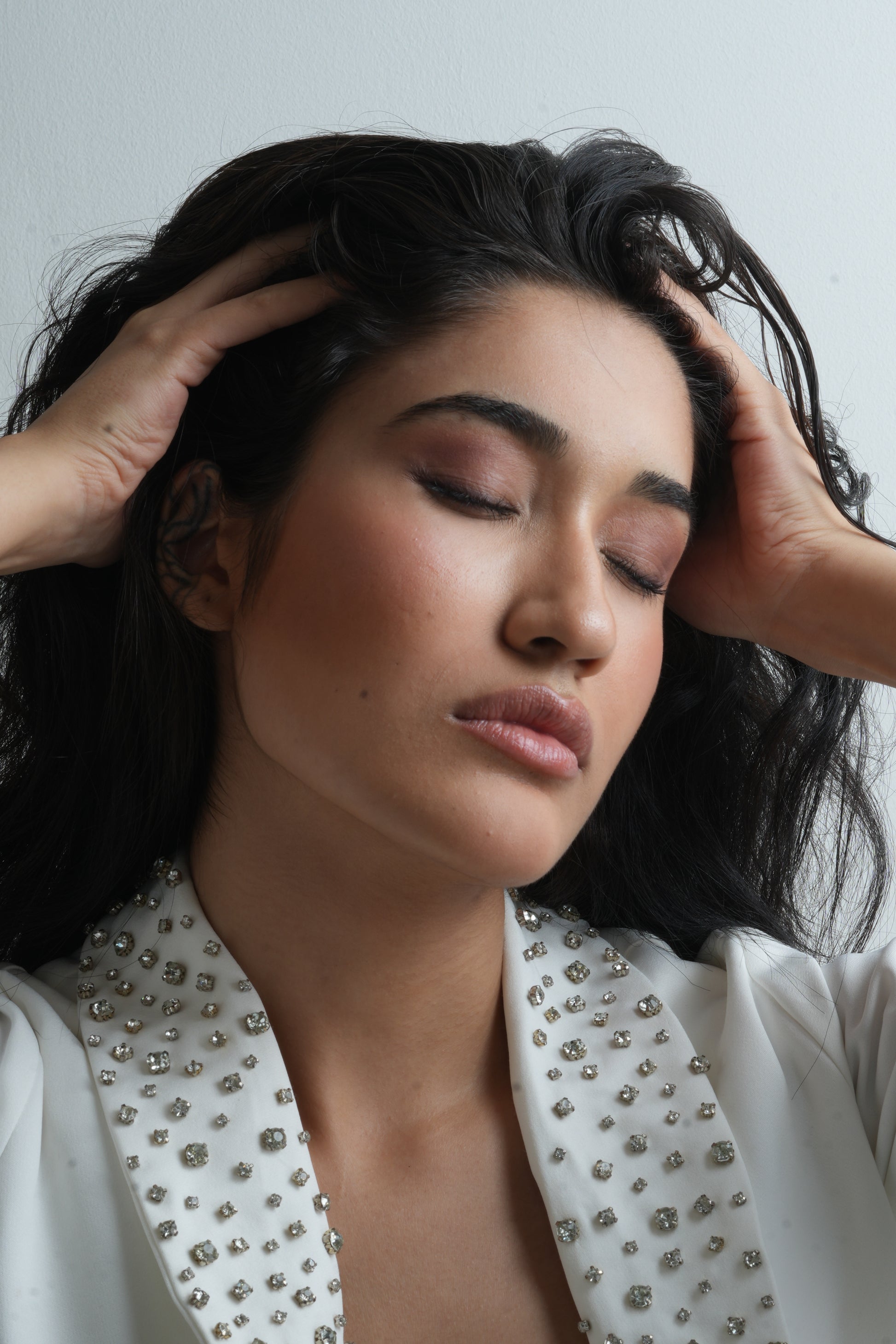 designed in fluid banana crepe , the silhouette is enhanced with delicate cutdana , Moti and stone embroidery that adds subtle brilliance without overpowering the look