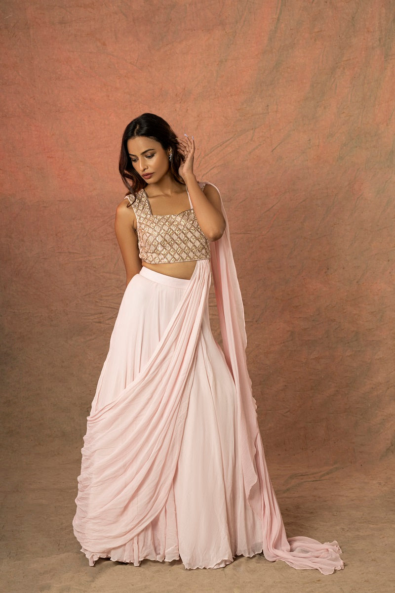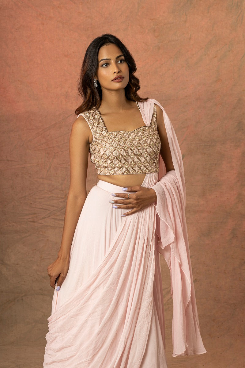 Jade dusty pink pure crinkle chiffon drape saree thread and beadwork bodice.