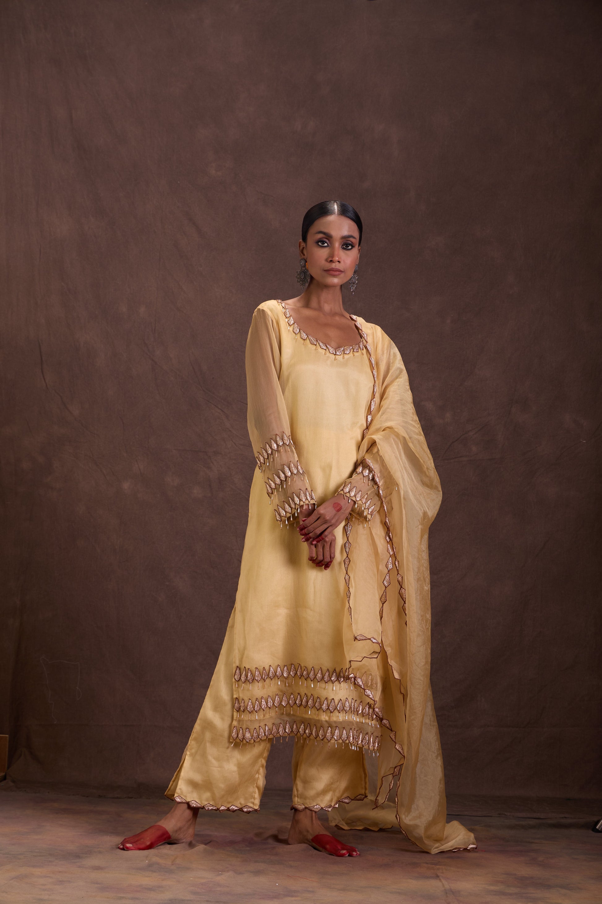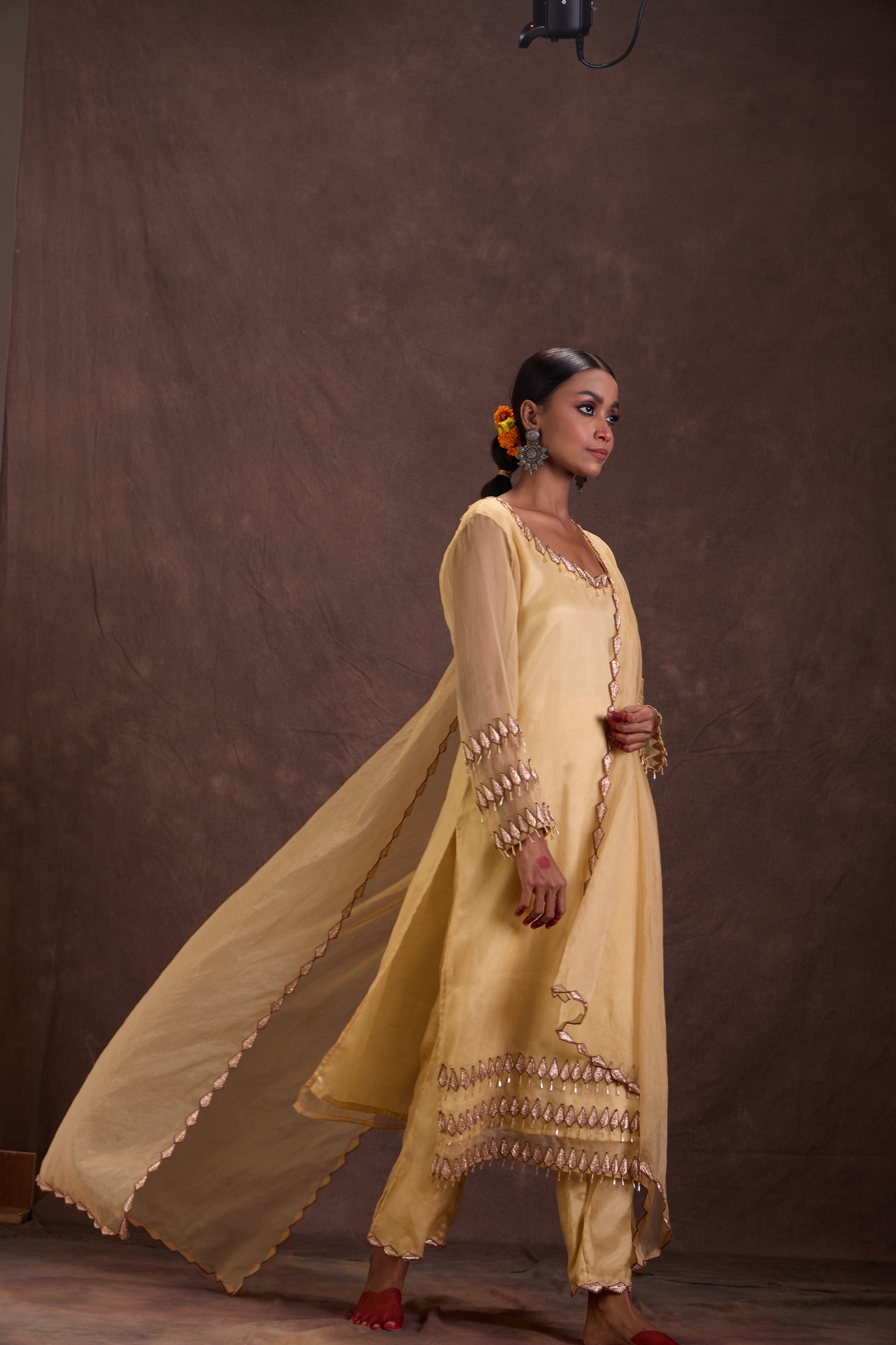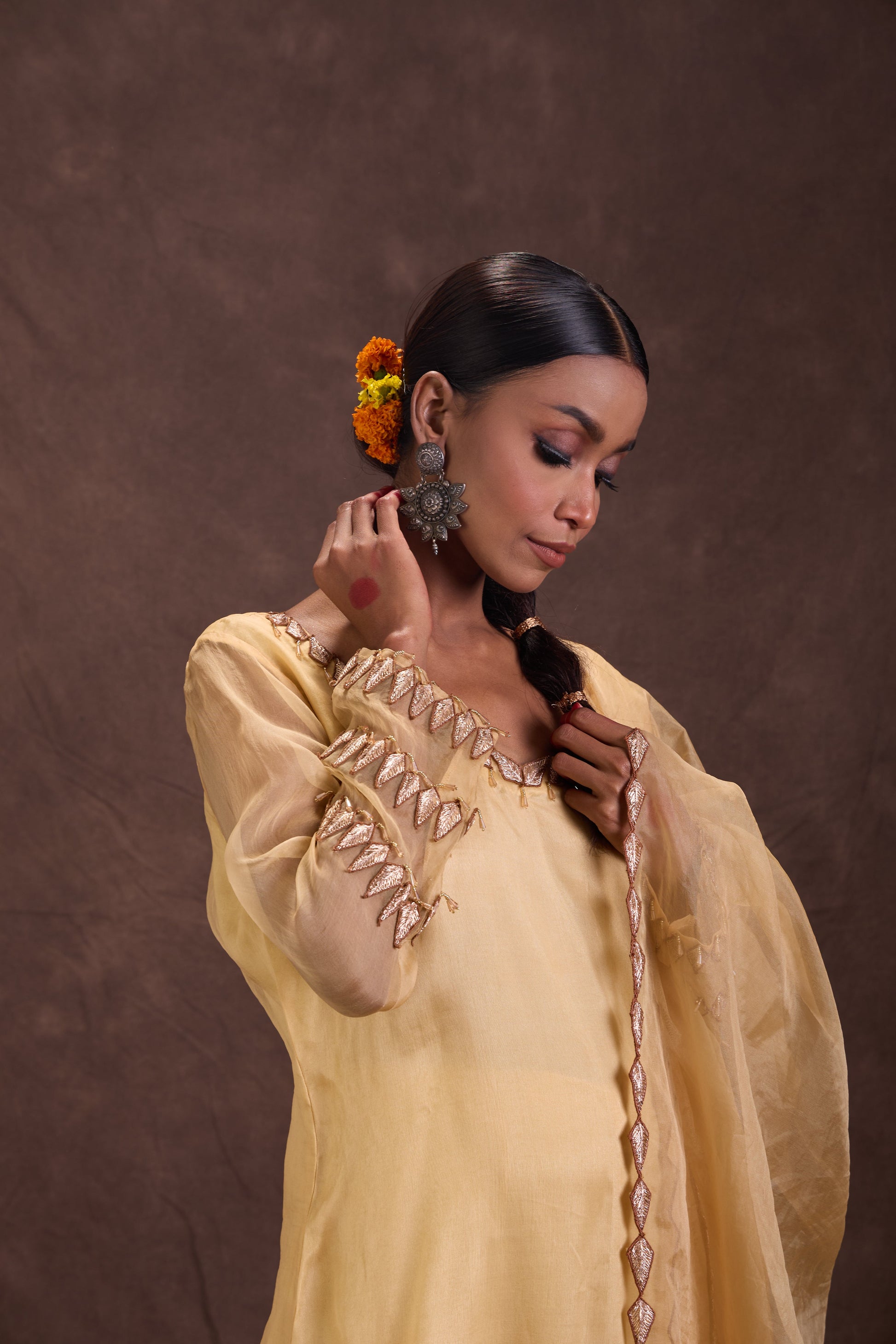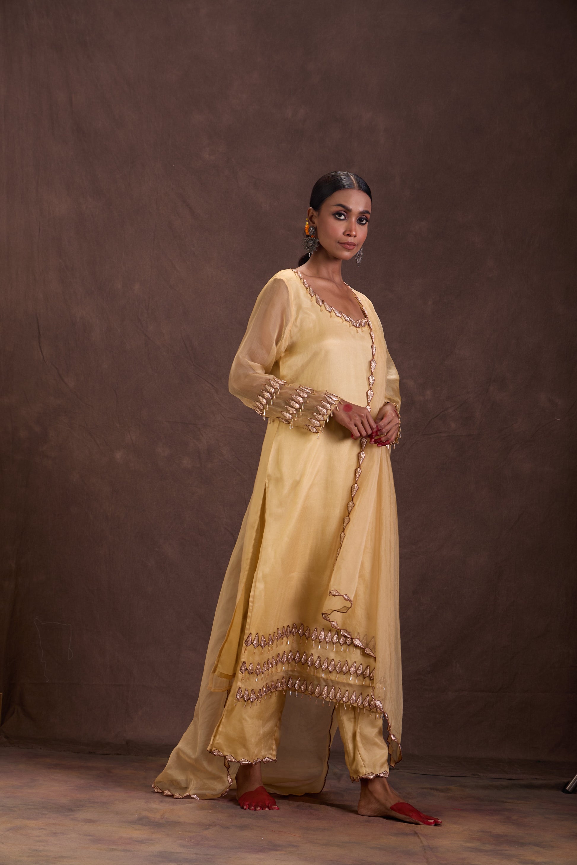 Sunehri — a serene ode to celebration. Crafted in fine organza and crepe, this dust-yellow ensemble features scalloped pearl edges, sheer embroidered sleeves, and delicate gota-shell detailing — a portrait of subtle radiance from Label Anjali Verma’s Jashn Collection.