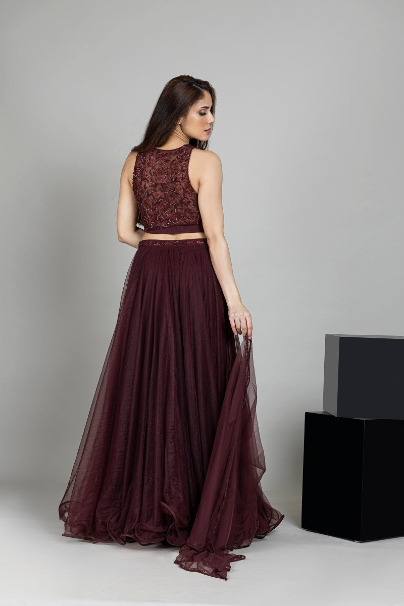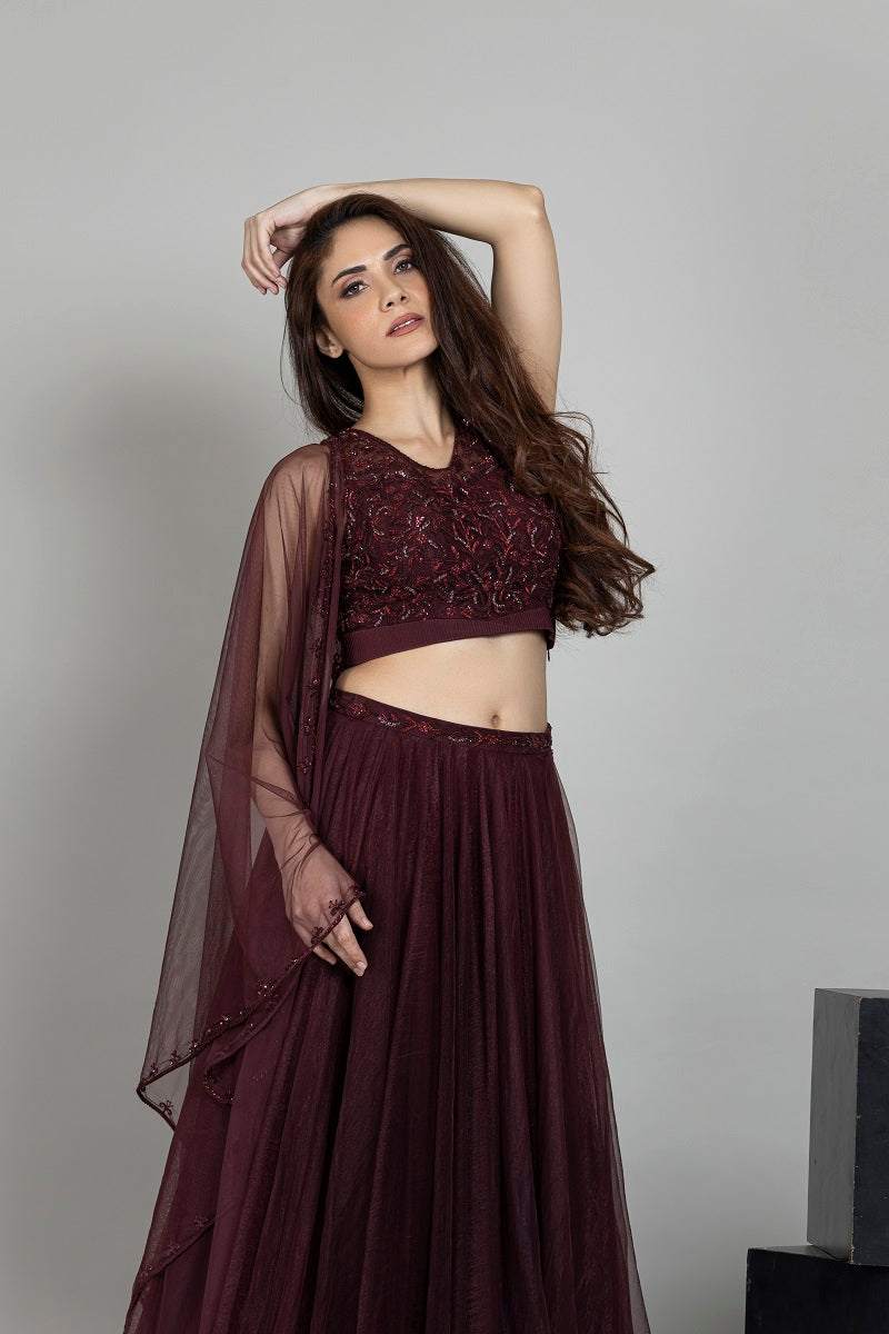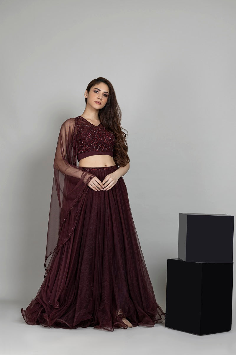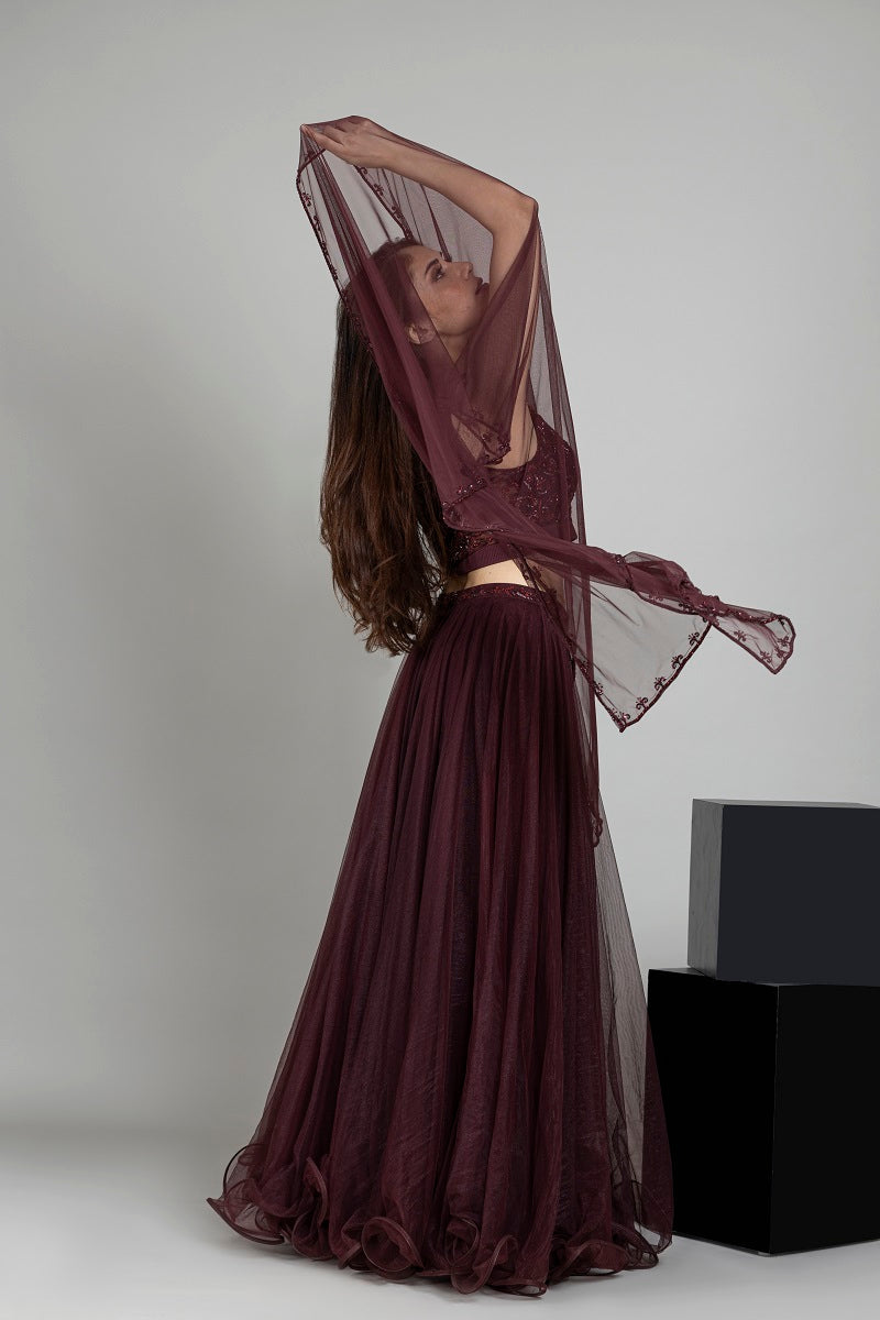 Mary blood mary bodice with zardozi work with floral motifs paired with flared net skirt styled with scalped chunni with fine zardozi border.