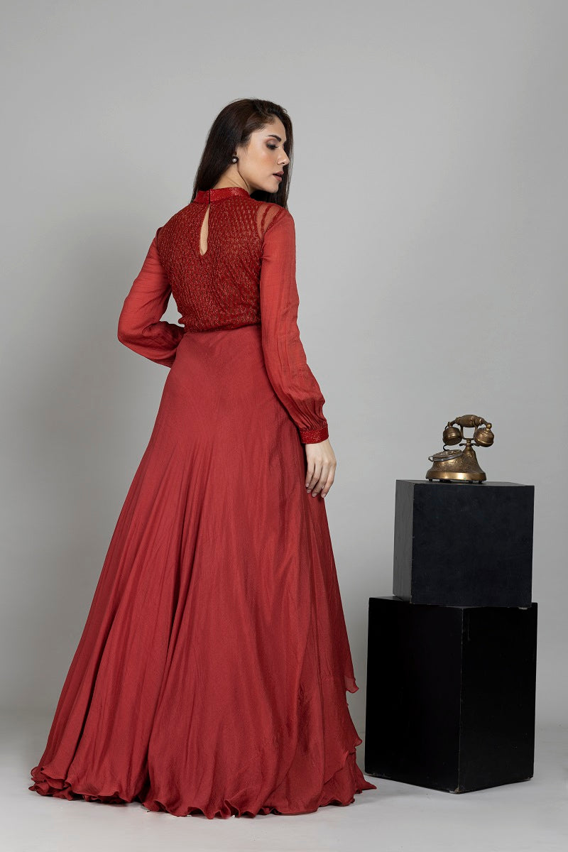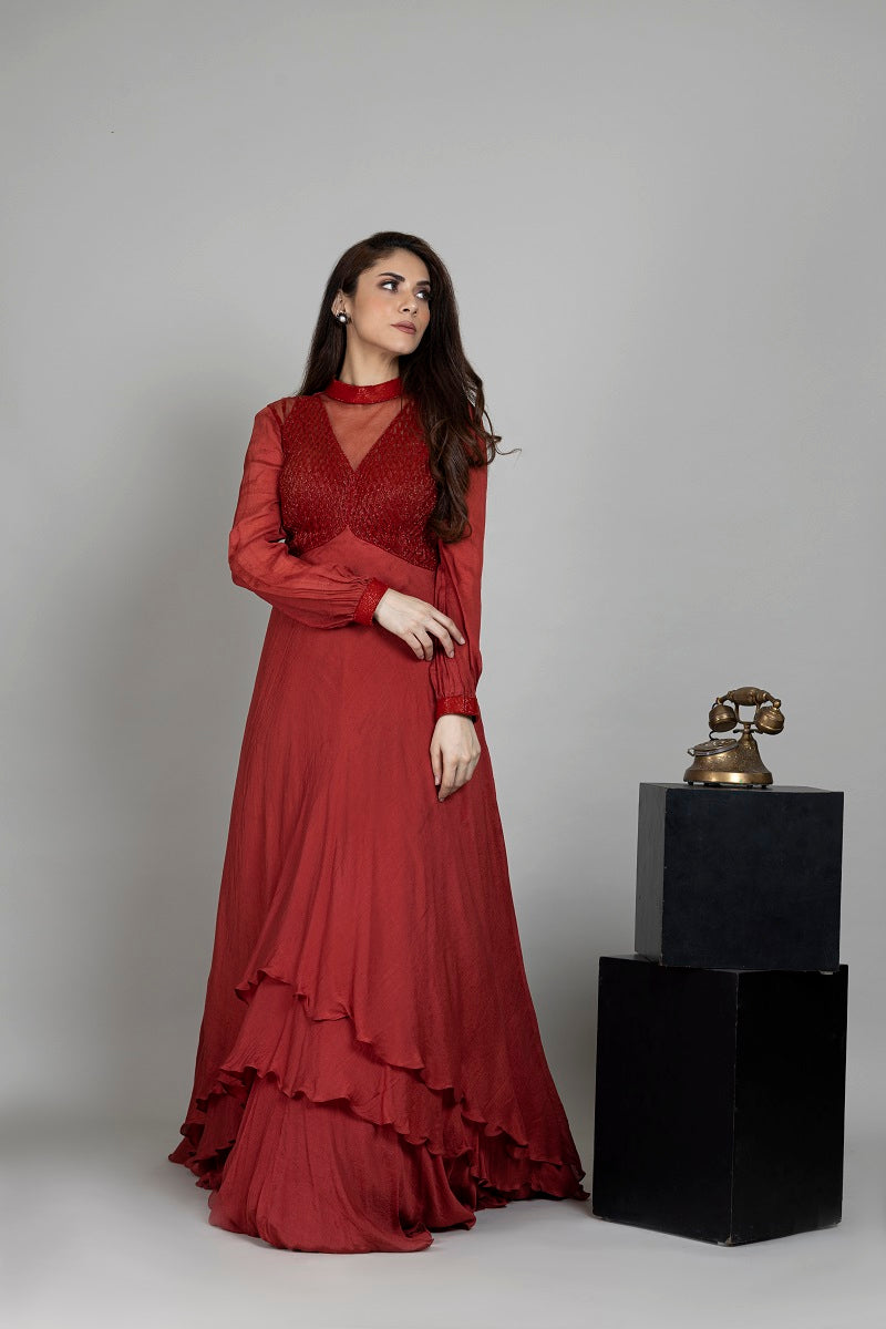 Migina scarlet pure chiffon heavy cut dana fine hand-embroidered leg-o-mutton sleeves with a multilayered bottom ball gown.