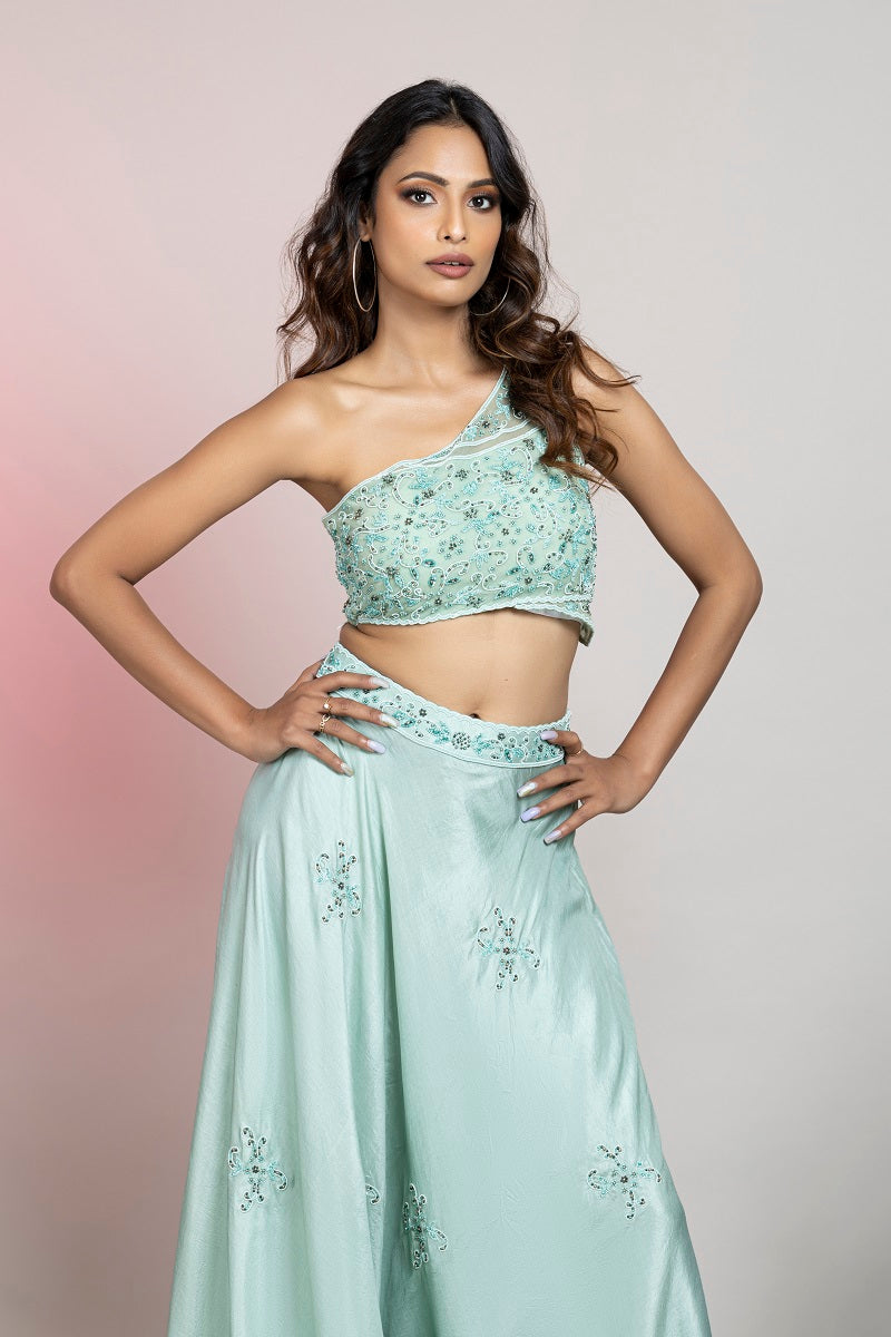 Naida turq green silk lehenga with one shoulder bead embroidered bodice paired with scalped skirt styled with fine bead scalped chunni.