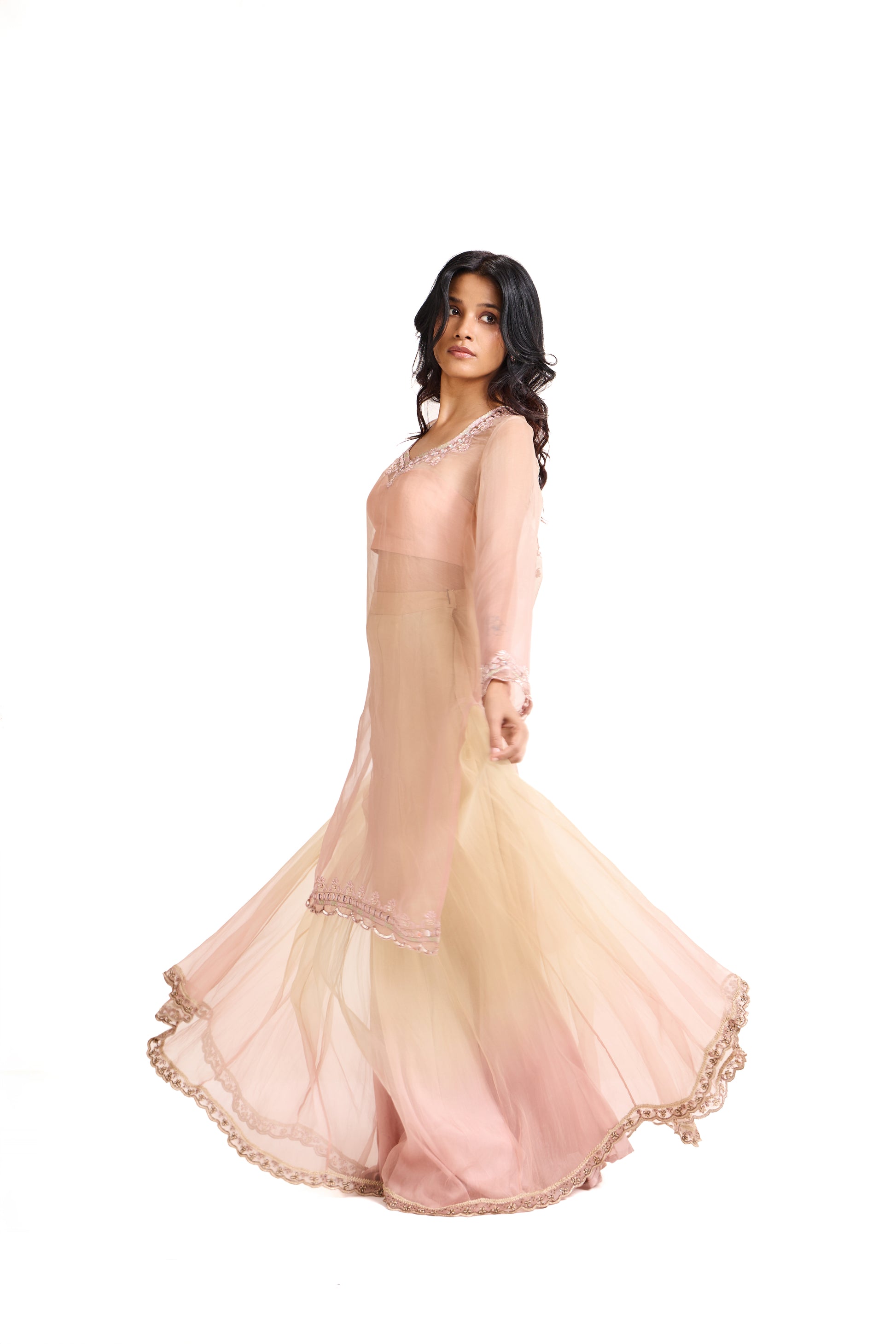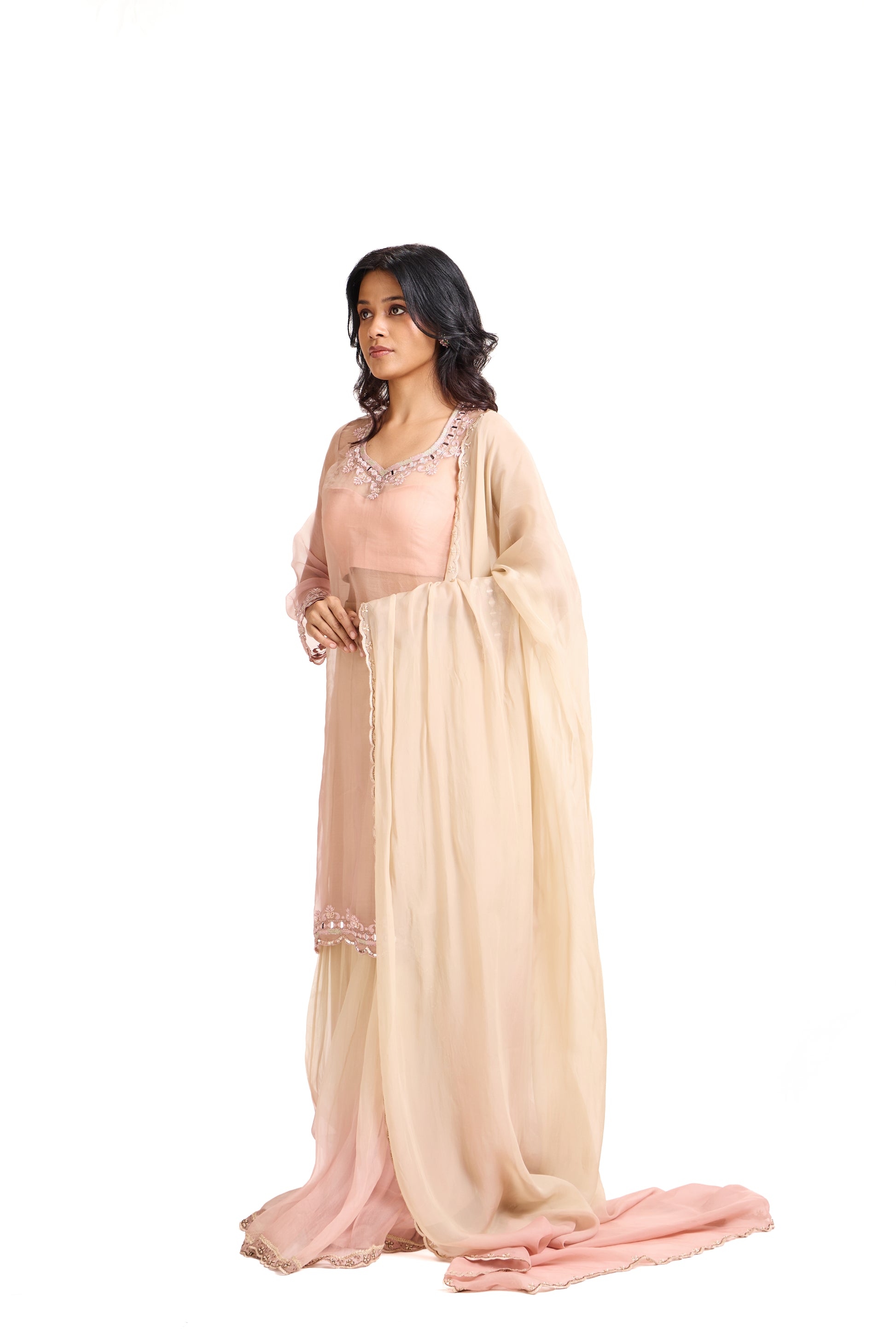Grace meets craftsmanship in this ethereal kurta set, crafted from luxurious pure silk organza and soft flat chiffon. Designed in a delicate beige to pink ombre shade, this ensemble reflects understated elegance and timeless femininity.
