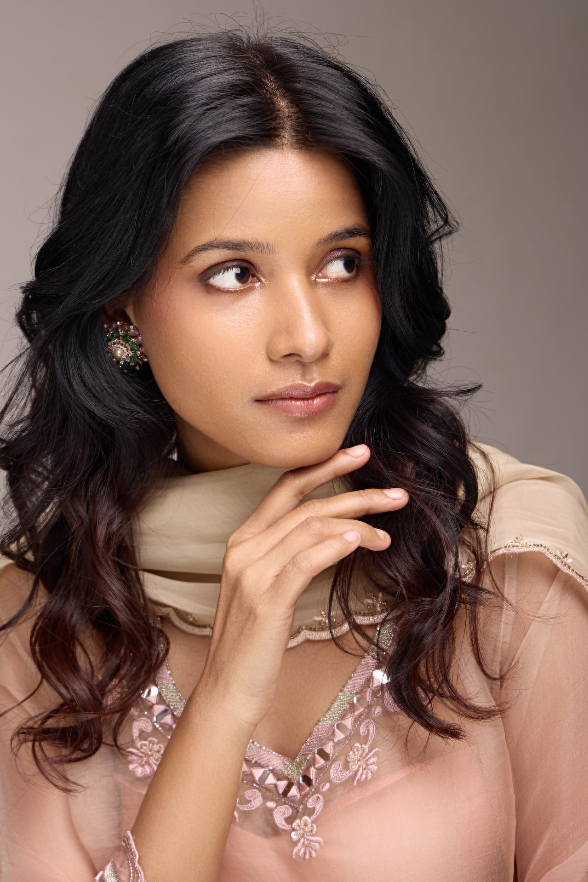 The kurta features intricate hand-beaded embellishments using resham, beads, and mirror detailing, adding subtle shimmer and artisanal depth. Floral detailing along the edges enhances the romantic aesthetic, while tassel accents add gentle movement and charm. Paired with a flowing chiffon bottom and a sheer organza dupatta, this ensemble is perfect for intimate celebrations, festive gatherings, and refined occasion wear.