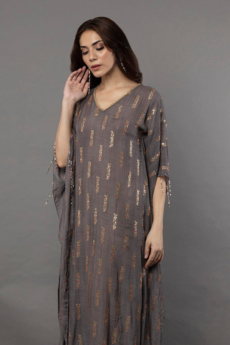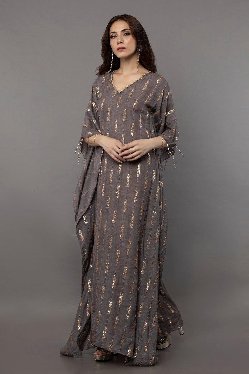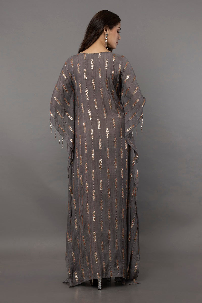 Sayuri kaftan embellished with sequins & thread work in a linear pattern, side slit at the torso.