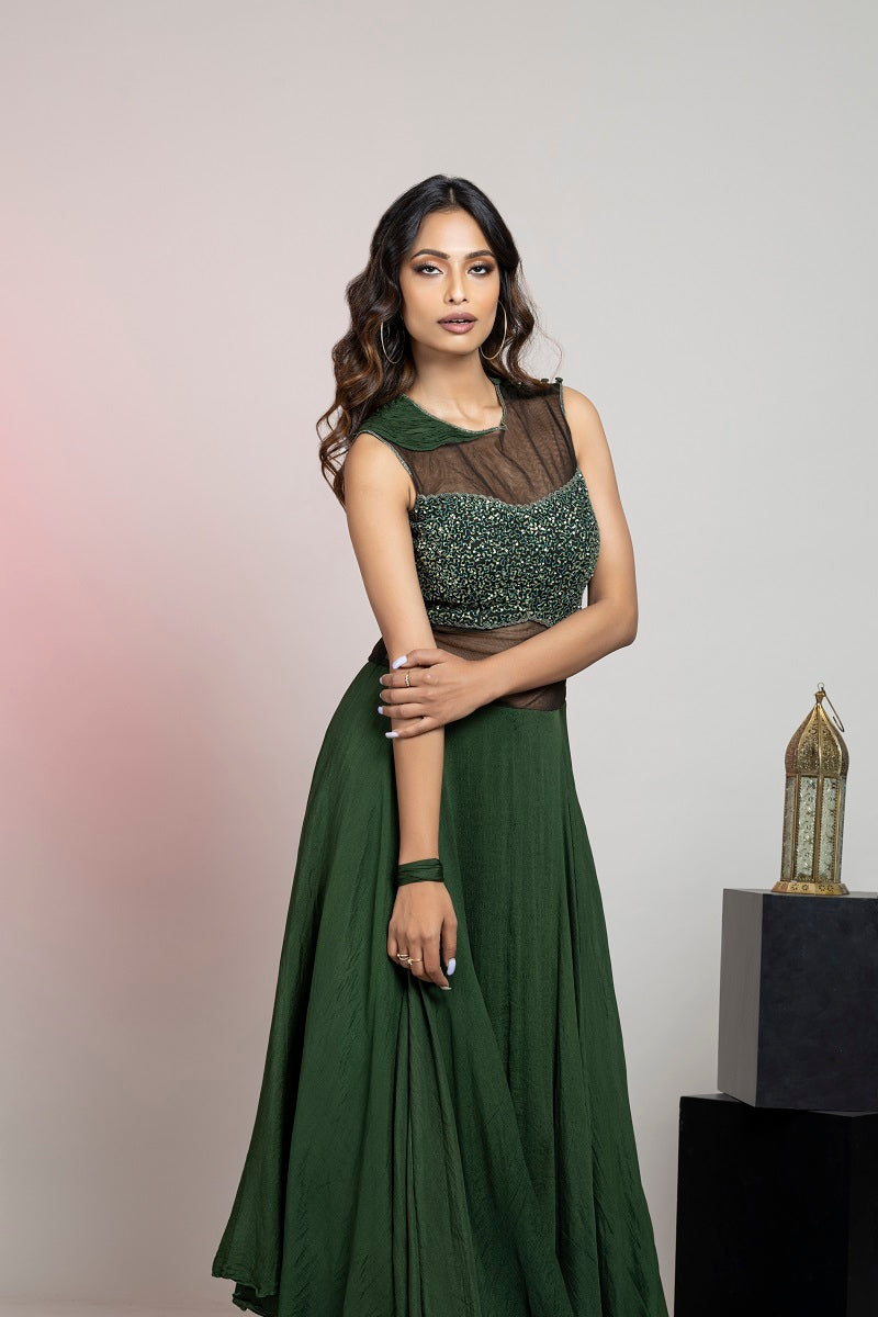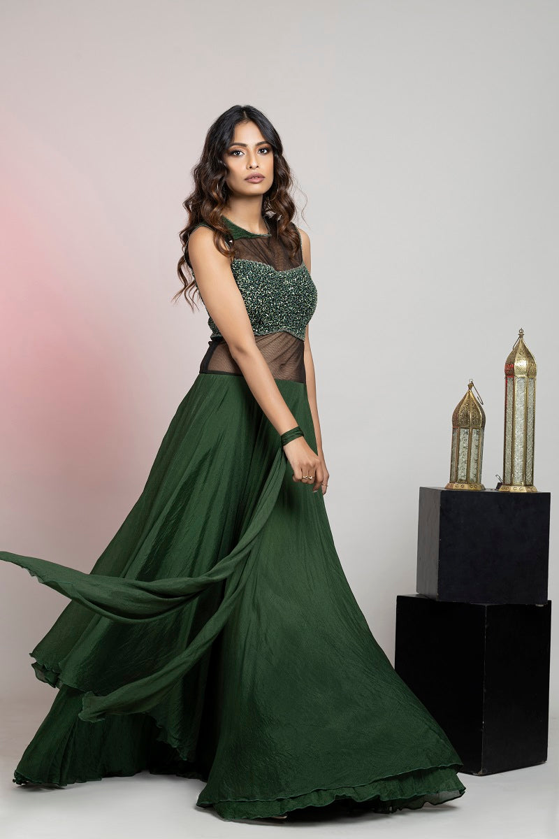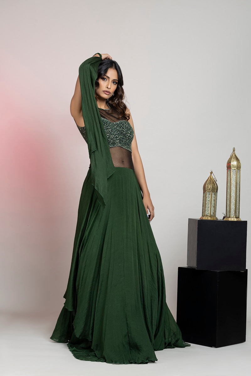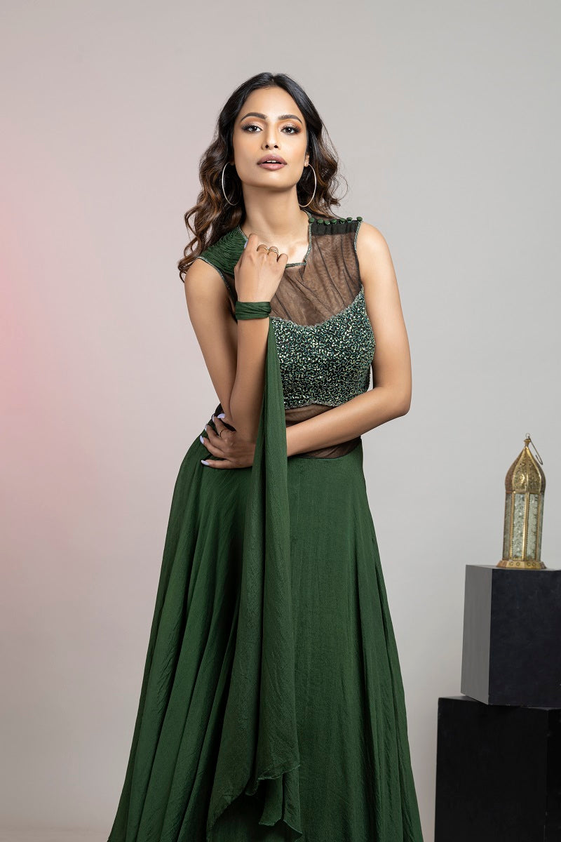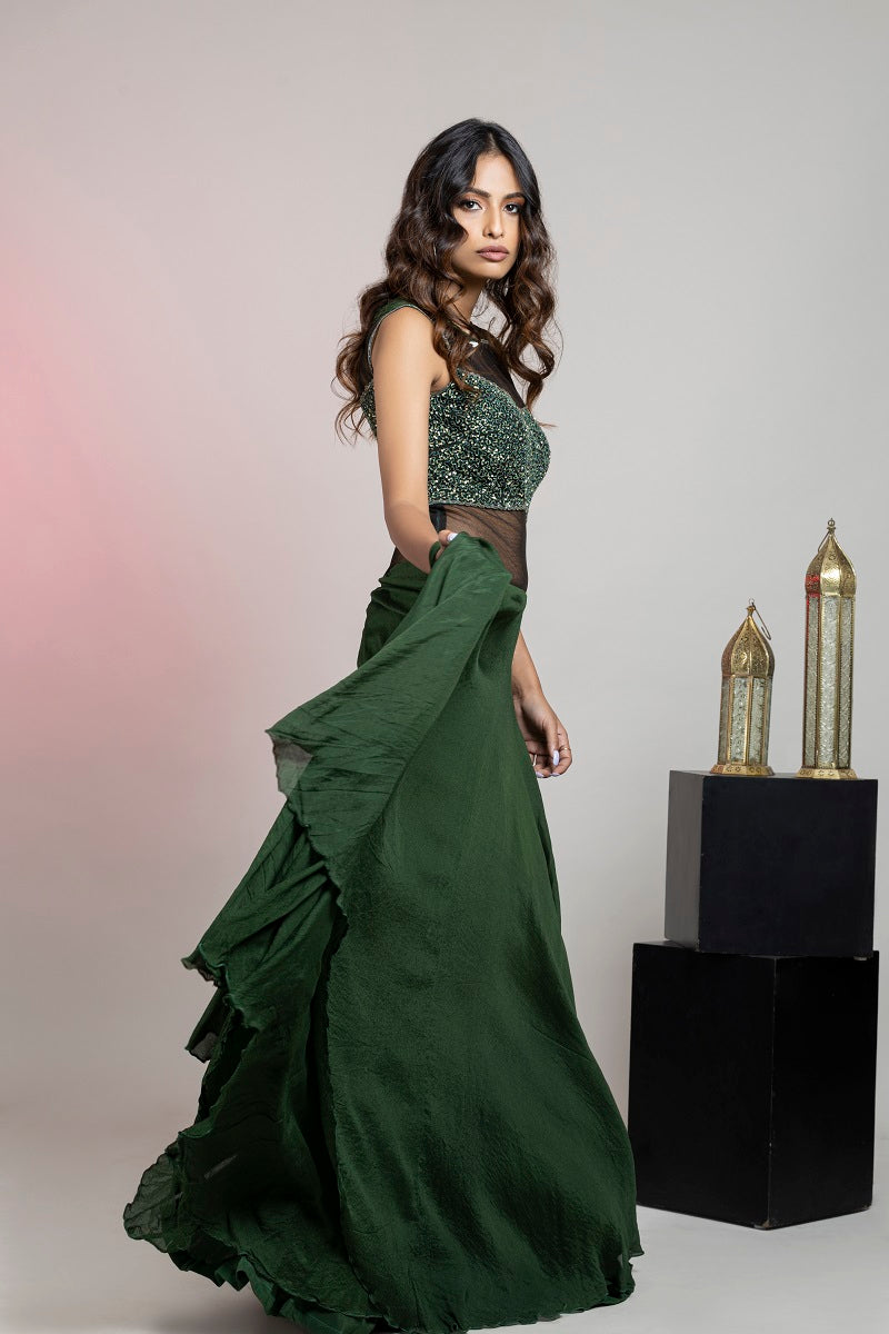 Sen royal olive green pure crinkle chiffon drape saree with sequin bead handwork with