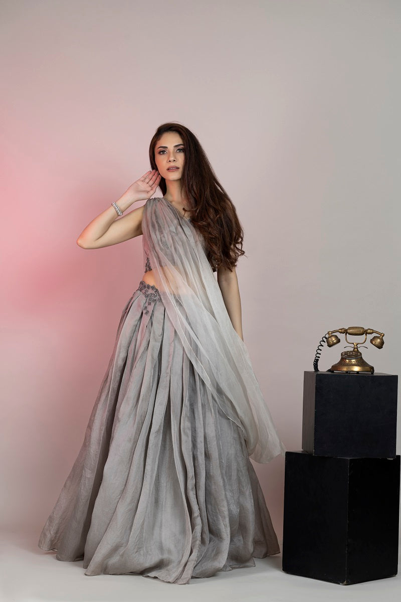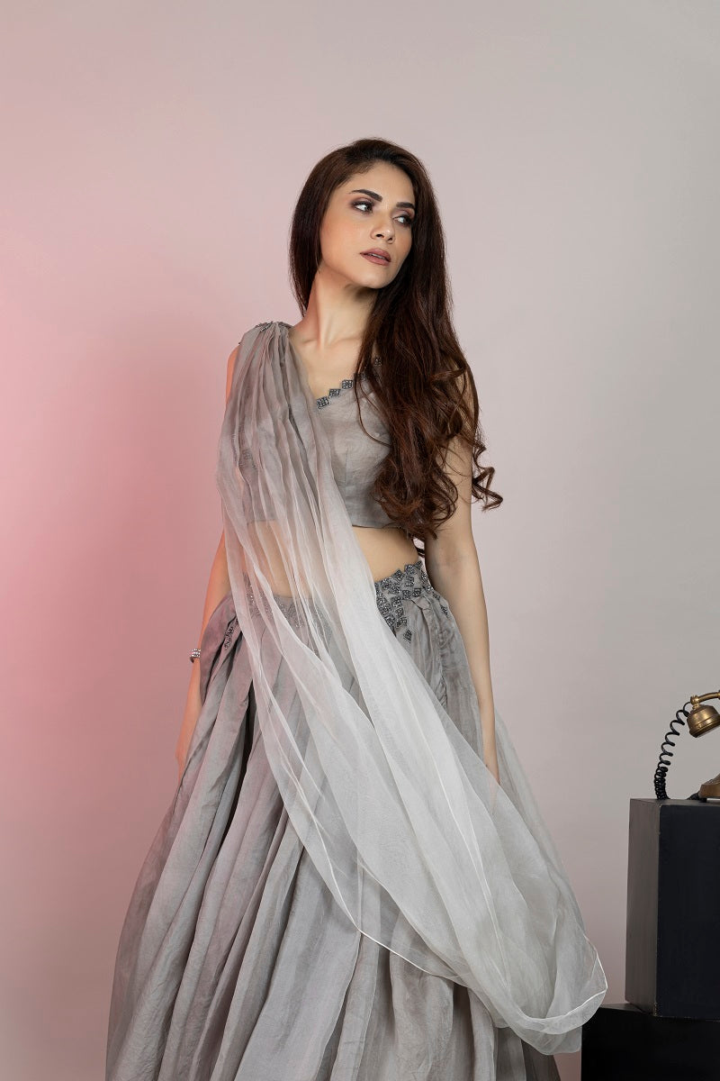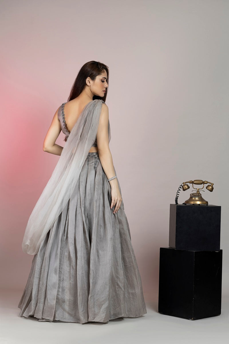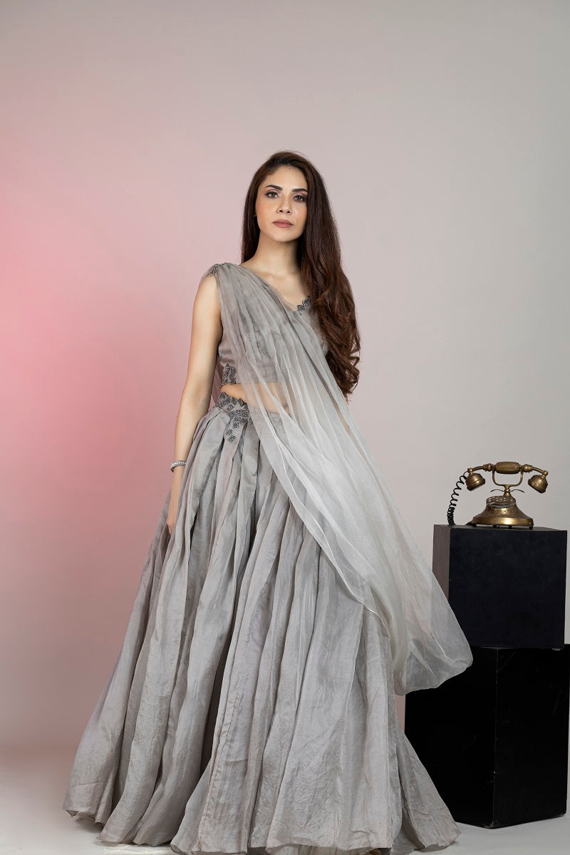 Seya grey pure silk organza bodice detailed with square tassel patchwork embroidery paired with box pleat pure silk organza skirt styled with ombre drape pleated at shoulder embellished with crystal broch.