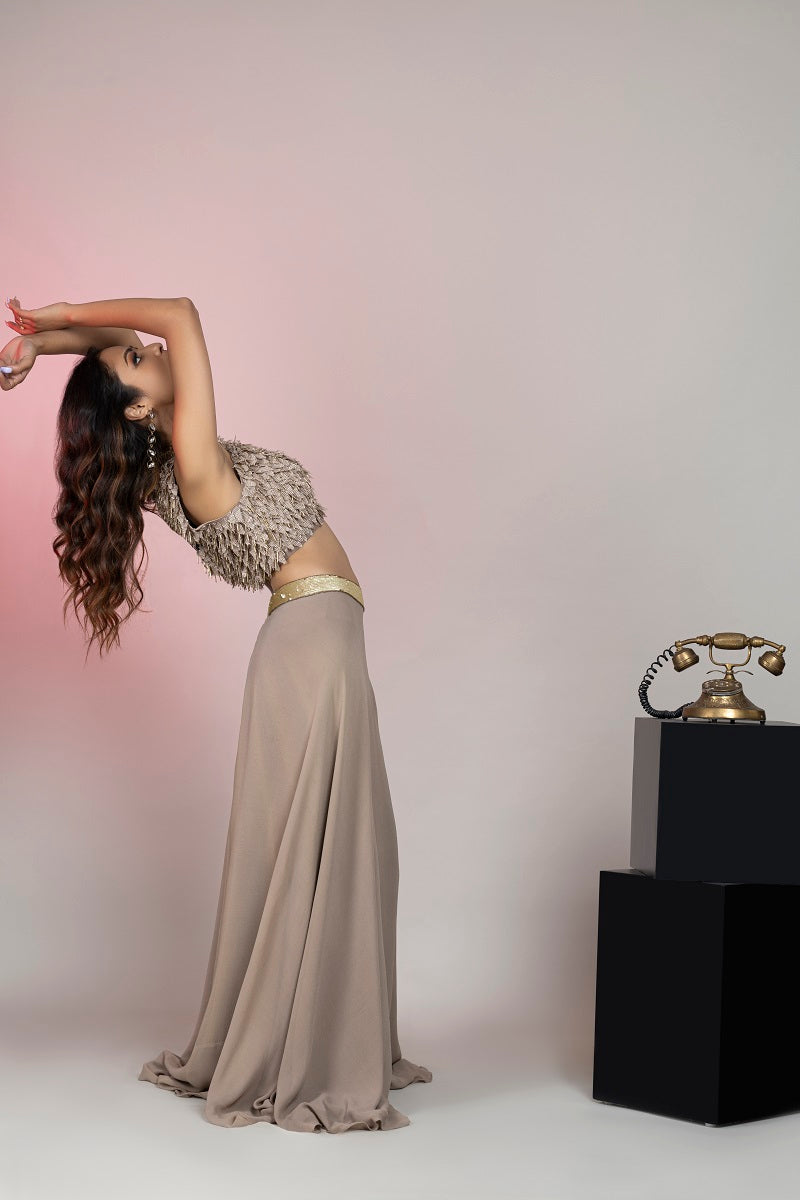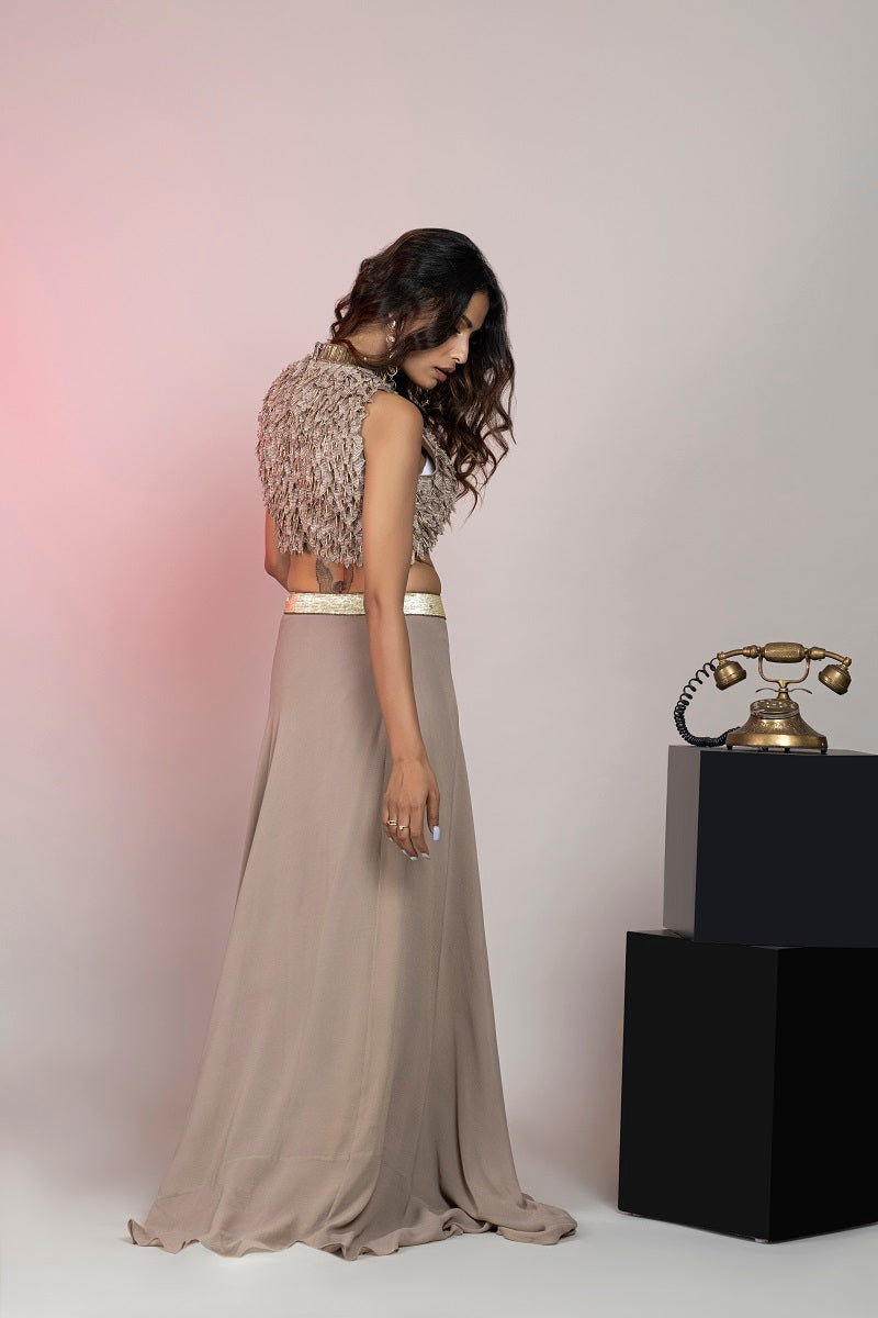 Tiana beige georgette jewelry collar, sleeveless back closing detailed with foil georgette cutwork hand tucked crop top paired with flared georgette skirt embellished with handmade sequins belt.