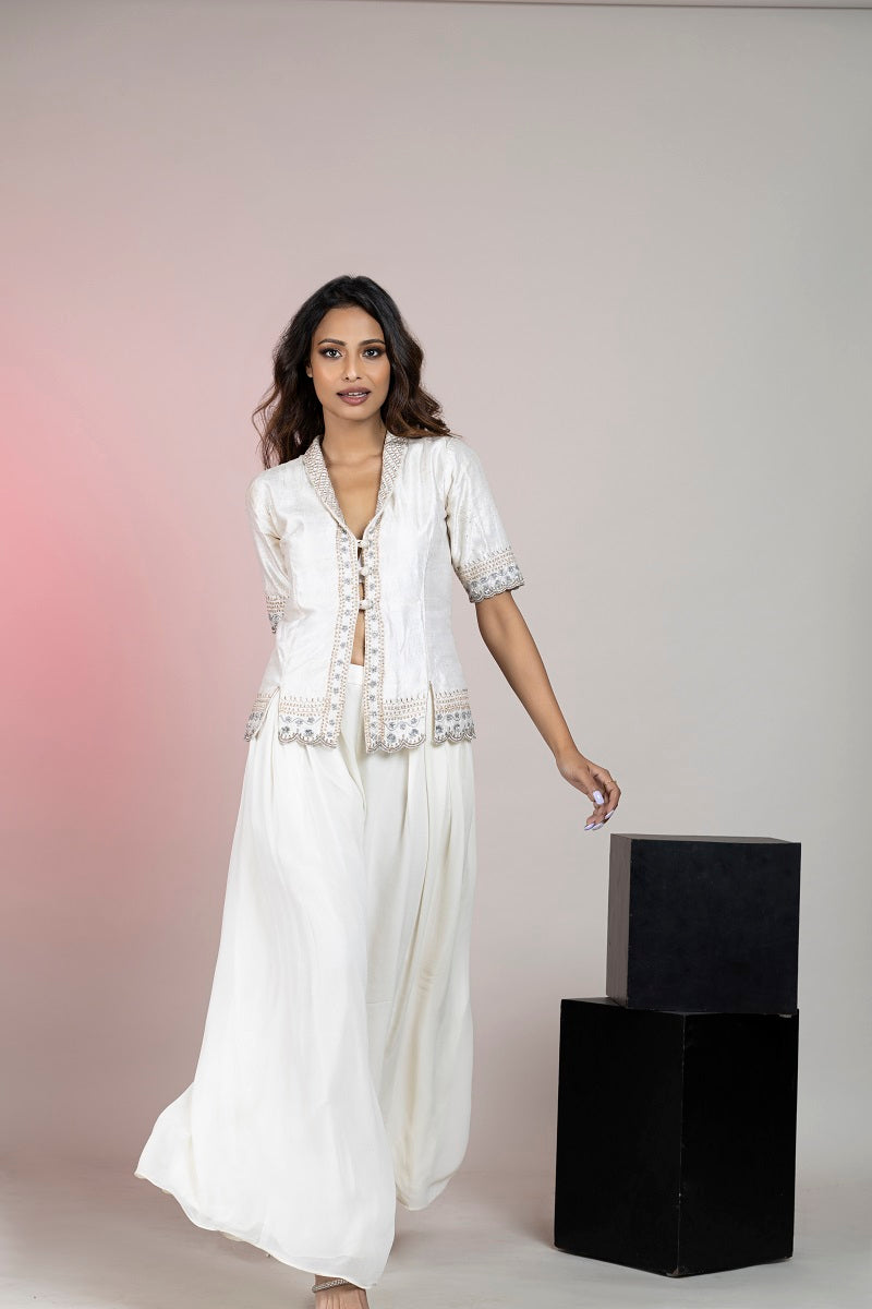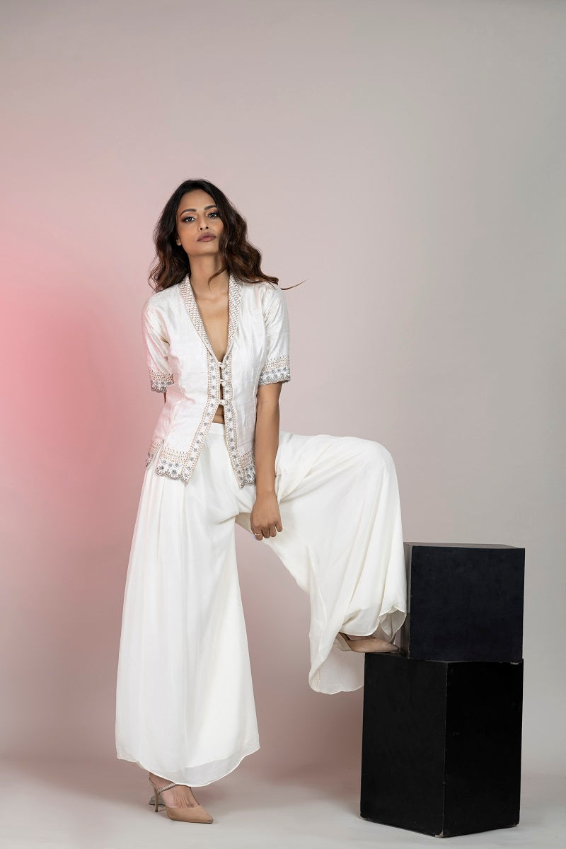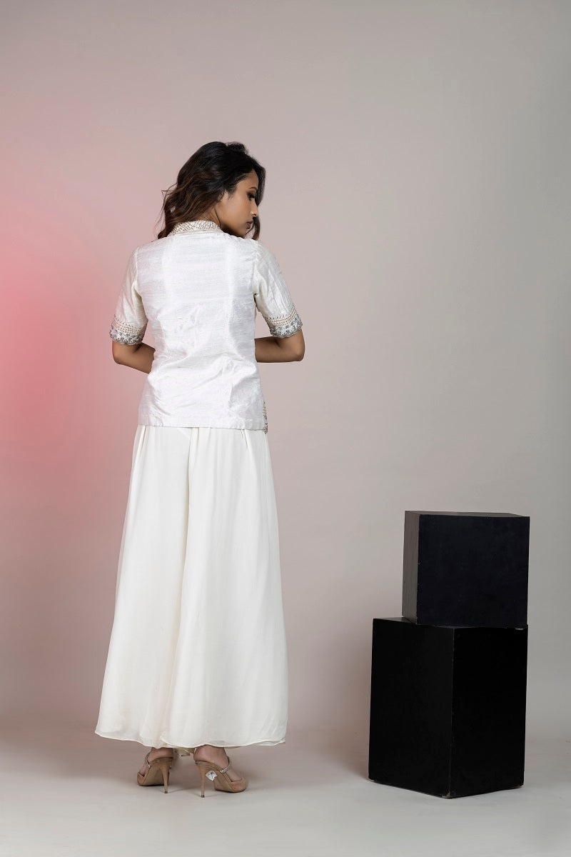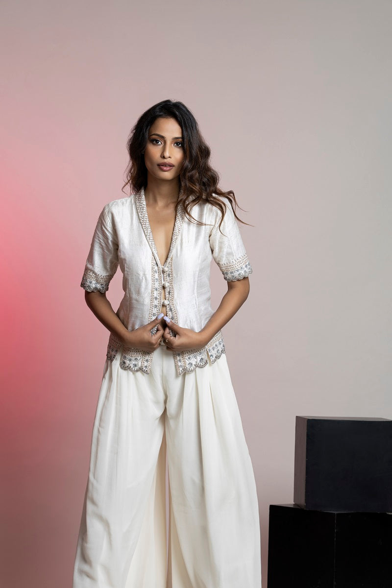 Zen pure raw silk front V-neck detailed collar with zari and beaded front open scalped jacket paired with cotton silk sequinned palazzo pants.