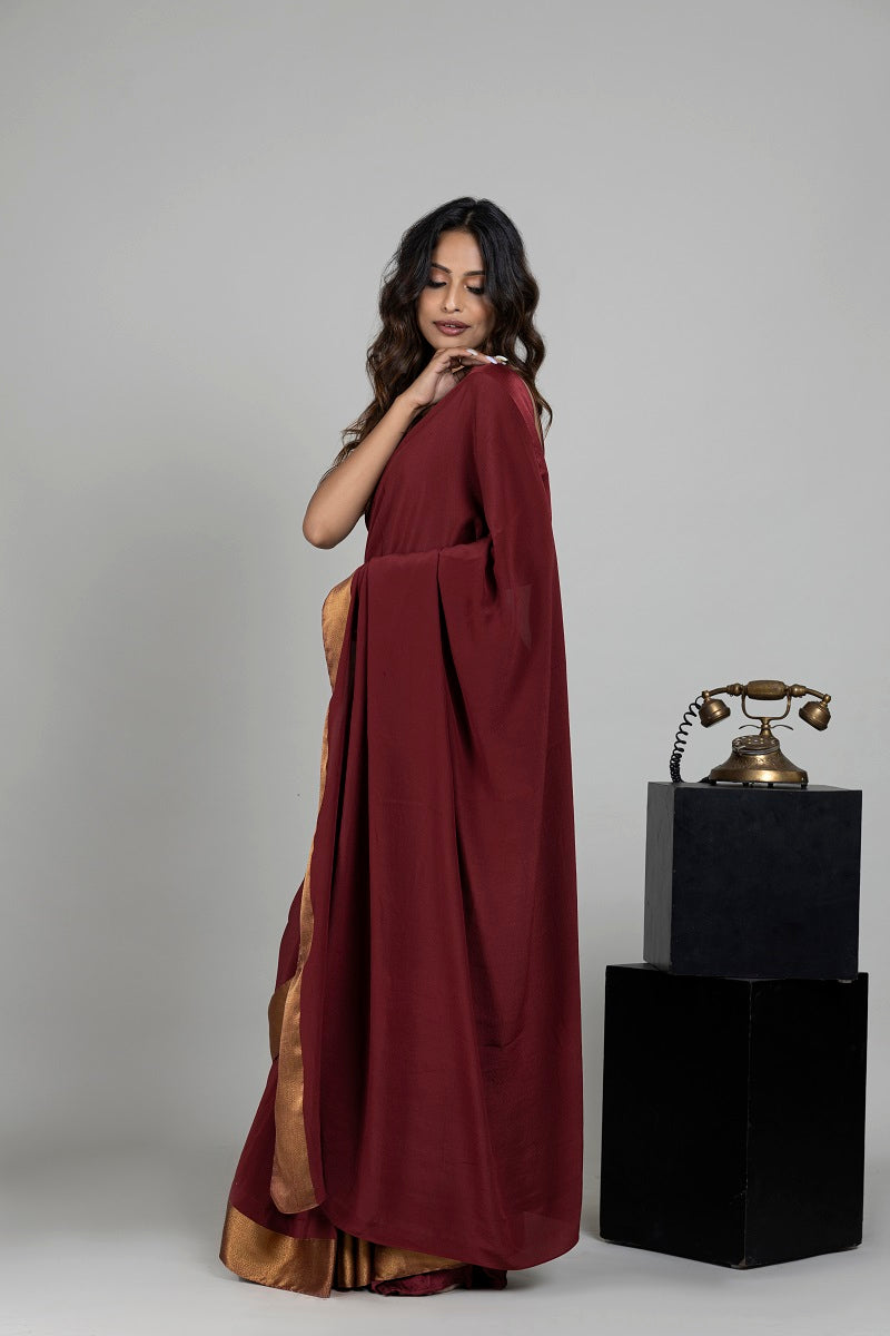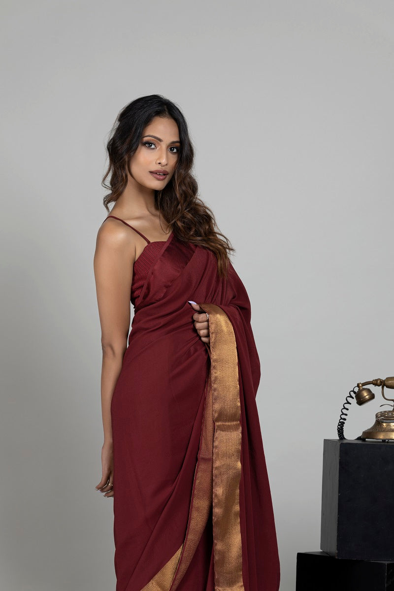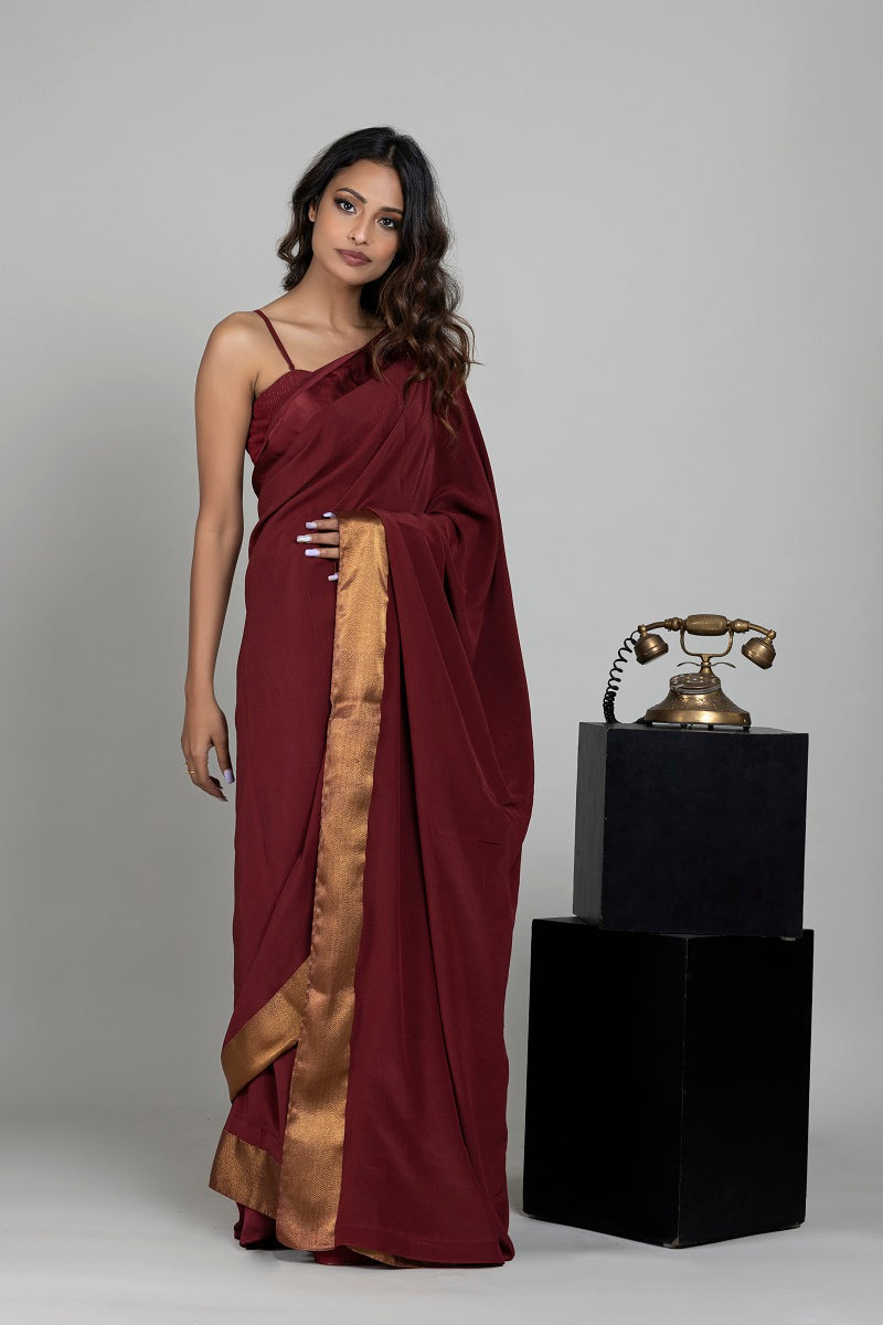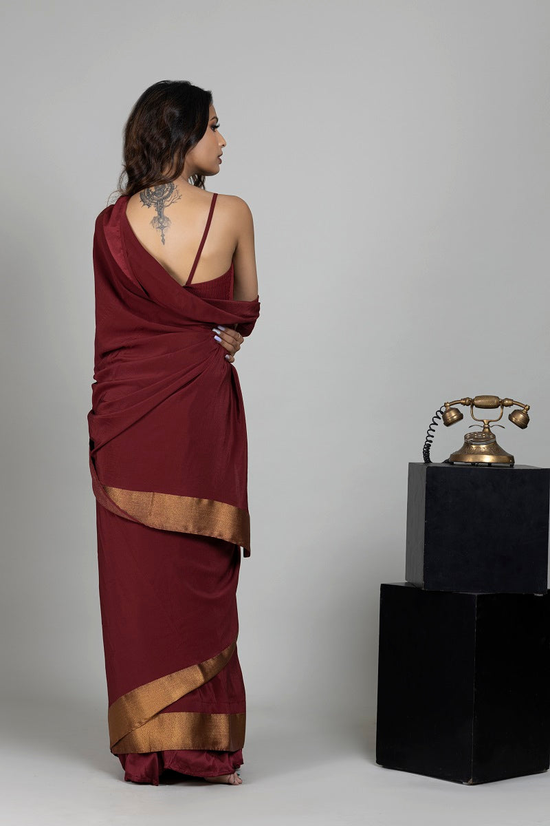 Zene mystic maroon pure crepe satin finish and gold weave bordered open saree paired with linear thread work noodle strap border with additional underskirt.